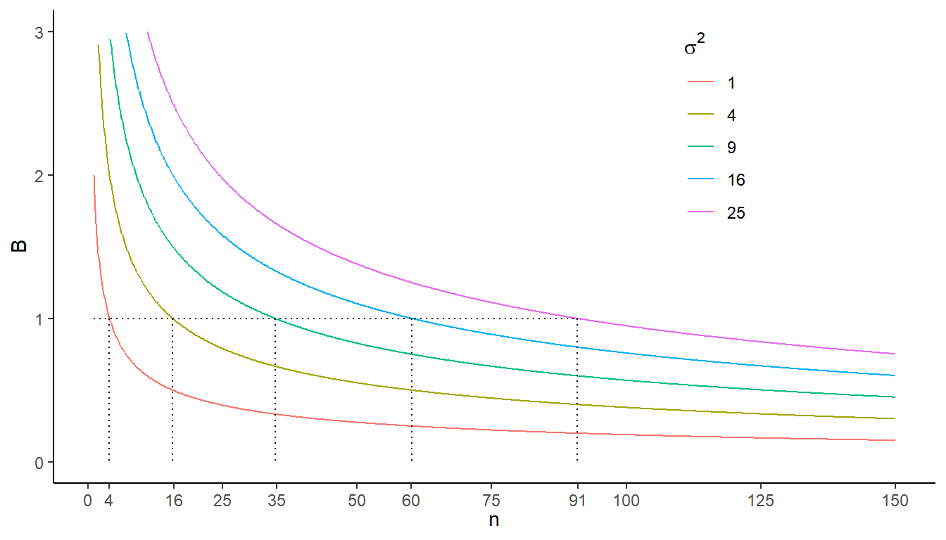 would yield \(B\) = 1 if \(N\) = 1000 and \(\sigma^2\) = 1, 4, 9, 16, or 25 when using