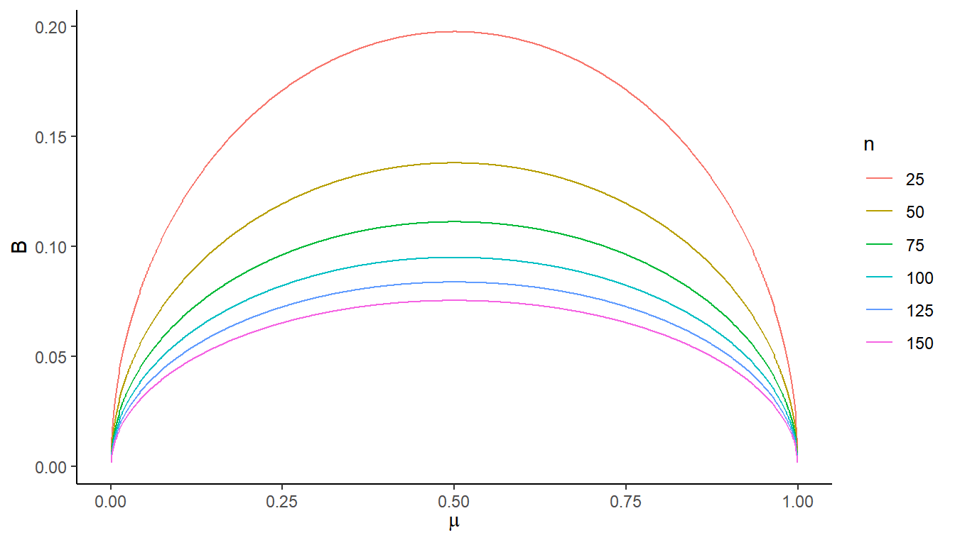 \] This reaches its maximum when \(\mu\) = 0.5 so \[