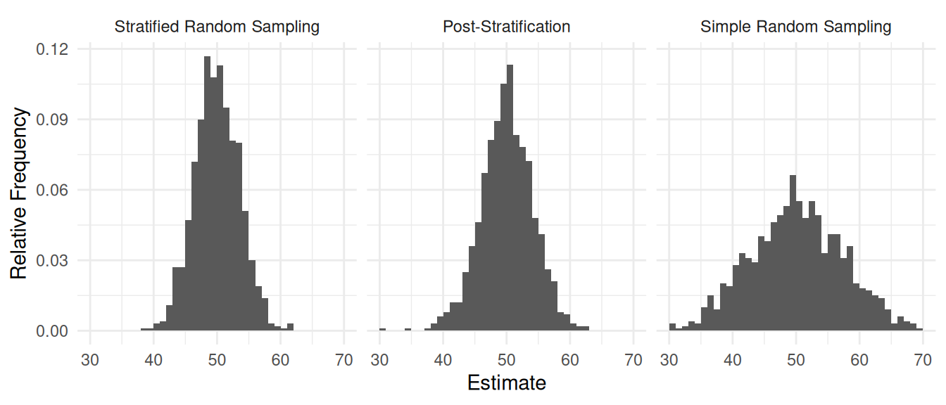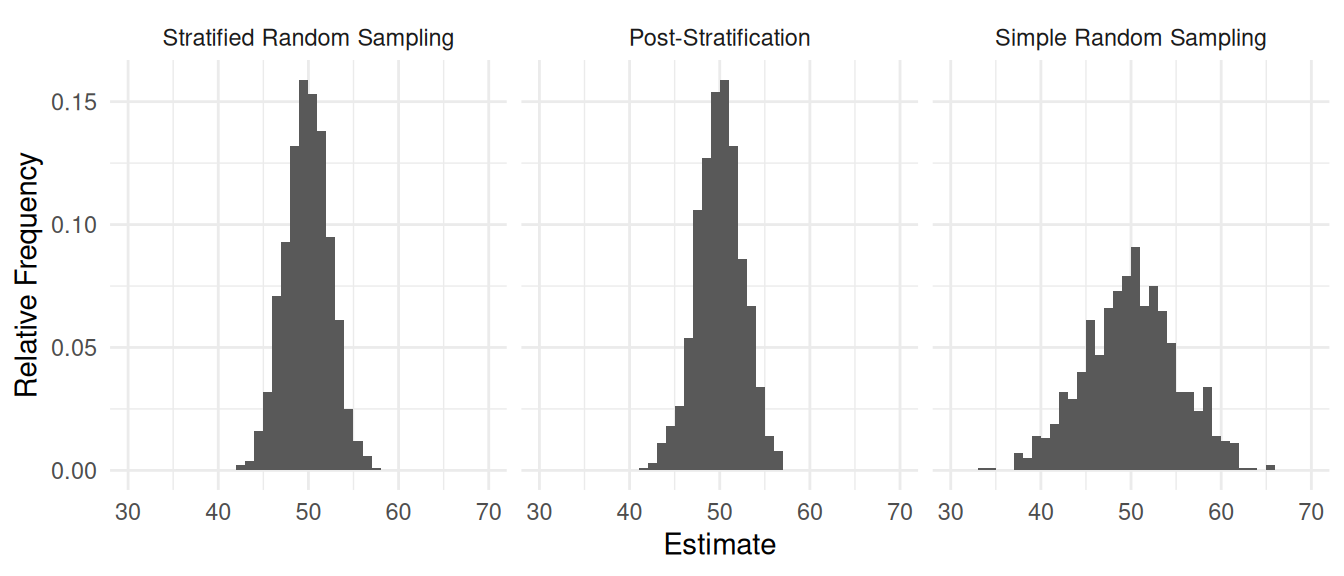 Post-stratification can be viewed as re-weighting. If we use a simple random sampling design we could use the estimator \[ \hat\tau = \sum_{i \in \mathcal{S}} w_iy_i, \] where \(w_i = N/n\). But when using post-stratification we use our knowledge of the stratification of the elements to re-weight by replacing these weights with those from a stratified random sampling design where now \(w_i = N_j/n_j\) if the \(i\)-th element is known to be within the \(j\)-th stratum.