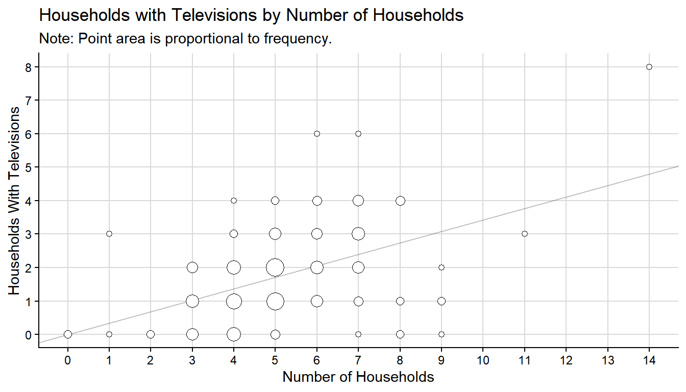 We can compute \(\bar{y} \approx\) 1.8 and \(\bar{x} \approx\) 5.23. The estimate of the proportion of households with TVs is \(r \approx\) 0.34.