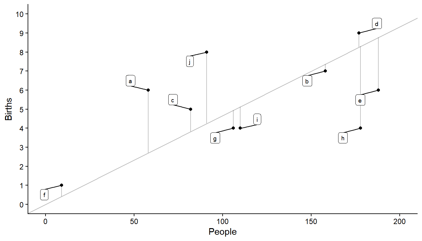 We have that \(\bar{y}\) = 5.4 and \(\bar{x}\) = 115.7, so the estimated birth rate is then \(r\) = 5.4/115.7 \(\approx\) 0.05 births per person.