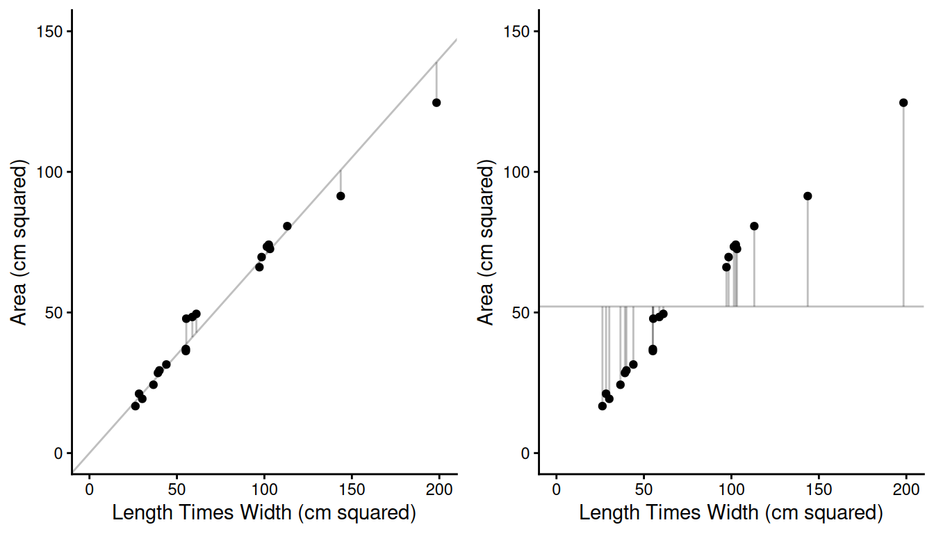 Example: The area of each of 744 leaves from a shining gum (Eucalyptus nitens) was crudely approximated by multiplying leaf length and width. The area of each leaf of a simple random sample of 20 leaves was measured accurately.| \(i\) | Area | Length \(\times\) Width |