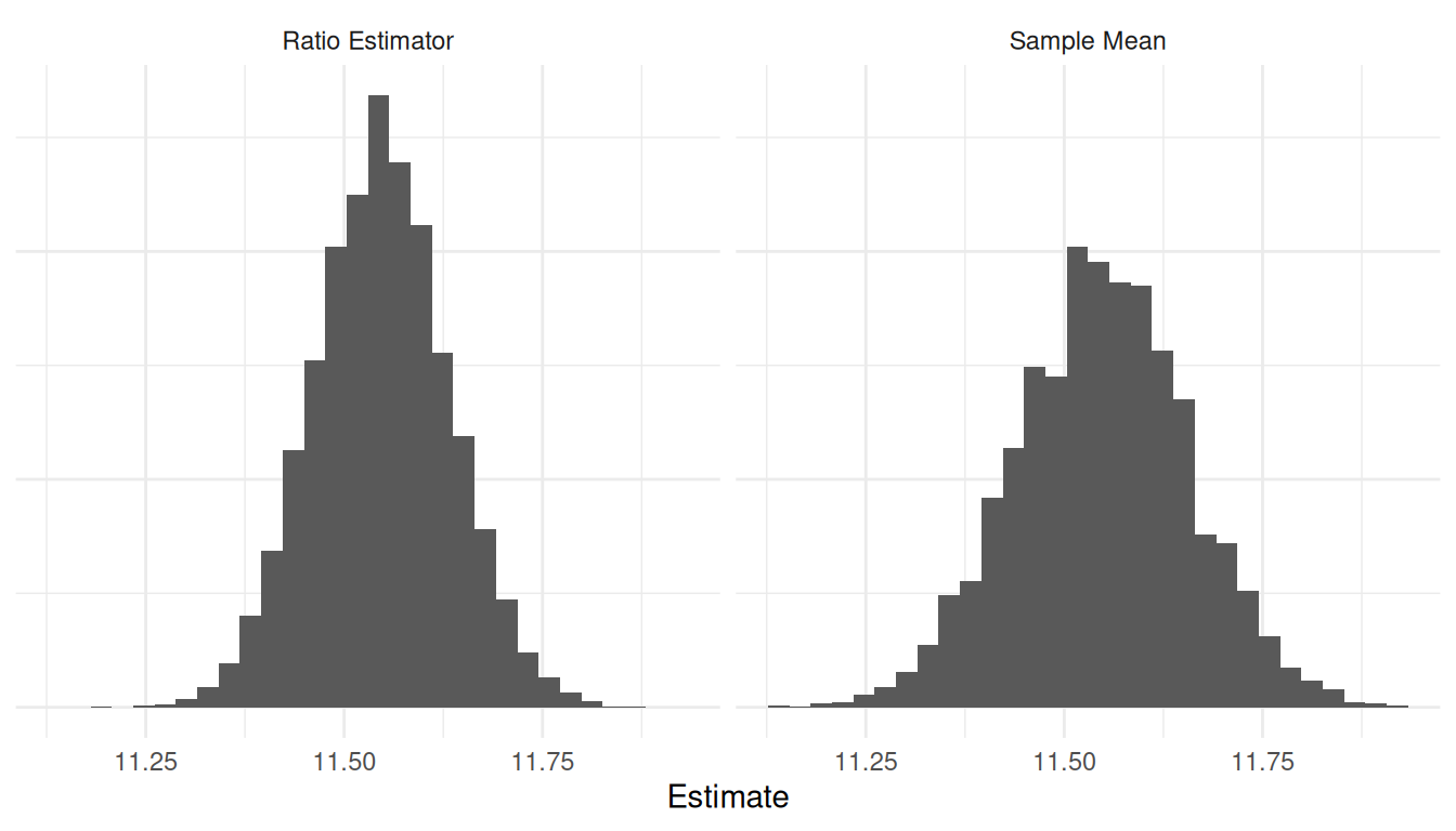 Let \(\mu_y = \mu_x\bar{y}/\bar{x}\) be the ratio estimator of \(\mu_y\). Under simple random sampling, the estimated variance of \(\hat\mu_y\) is \[ \hat{V}(\hat\mu_y) = \left(1 - \frac{n}{N}\right)\frac{s_r^2}{n} \ \ \ \text{where} \ \ \ s_r^2 = \frac{\sum_{i \in \mathcal{S}} (y_i - rx_i)^2}{n-1}, \] where \(r = \bar{y}/\bar{x}\). Note that the estimated variance of \(\mu_y\) is very close related to that of \(r\). This isn’t surprising since we can write the ratio estimator as \(\hat\mu_y = r\mu_x\). The \(\mu_x\) cancels out the term \(1/\mu_x^2\) in the variance of \(r\) to create the variance of \(\mu_y\).