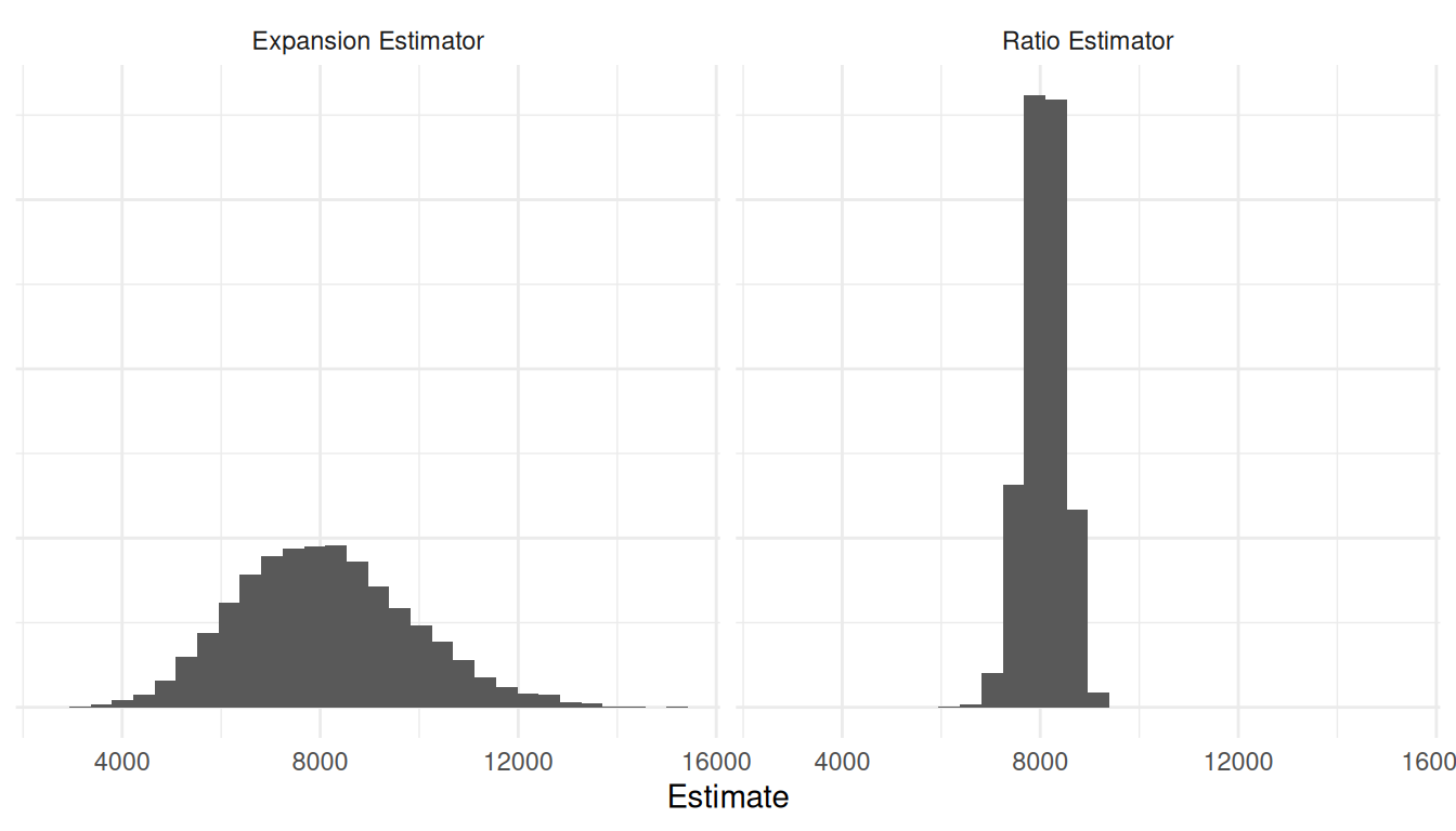 Consider that for a simple random sampling design \[ \frac{\mu_y}{\mu_x} \approx \frac{\bar{y}}{\bar{x}} \Rightarrow \mu_y \approx \frac{\bar{y}}{\bar{x}}\mu_x, \] so we could define an estimator of \(\mu_y\) as \[ \hat\mu_y = \frac{\bar{y}}{\bar{x}}\mu_x. \] Multiplying this estimator by \(N\) would give us an estimator of \(\tau_y\) since \(\tau_y = N\mu_y\), so that would be \[ \hat\tau_y = \frac{\bar{y}}{\bar{x}}\tau_x. \] The ratio estimators of \(\tau_y\) and \(\mu_y\) for a simple random sampling design are \[ \hat\tau_y = \frac{\bar{y}}{\bar{x}}\tau_x \ \ \ \ \ \text{and} \ \ \ \ \ \hat\mu_y = \frac{\bar{y}}{\bar{x}}\mu_x, \] respectively, where \(y\) denotes the target variable and \(x\) denotes an auxiliary variable. These are alternatives to the estimators, \[ \hat\tau_y = N\bar{y} \ \ \ \ \ \text{and} \ \ \ \ \ \hat\mu_y = \bar{y}, \] which do not use an auxiliary variable.