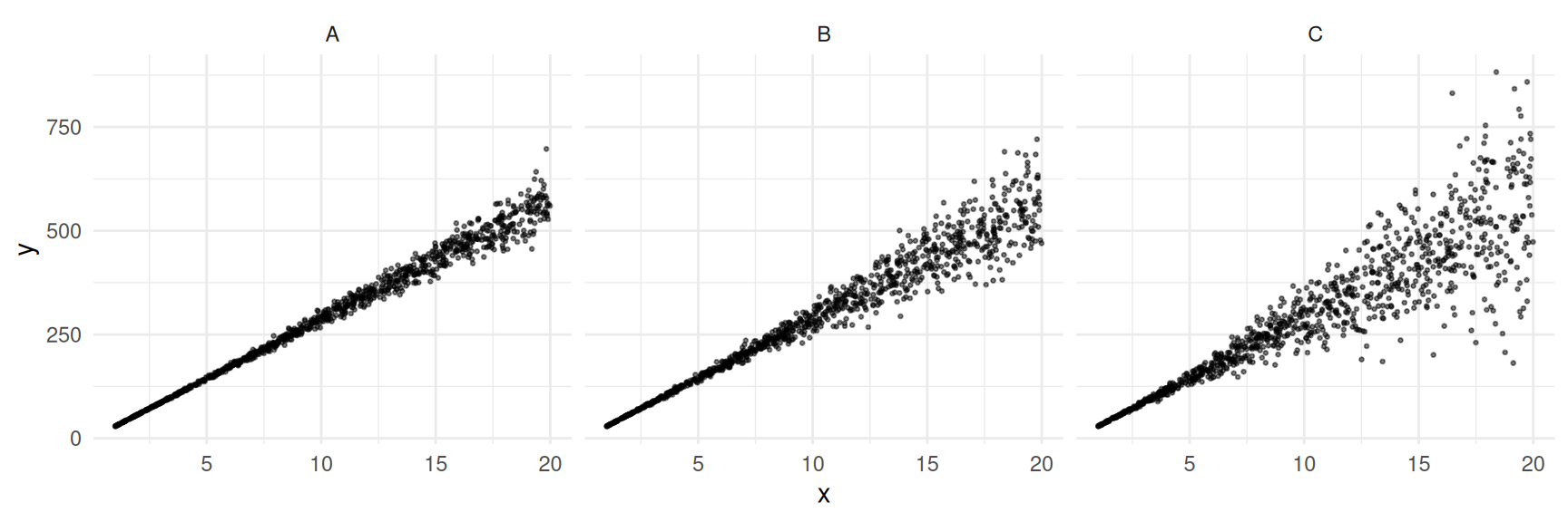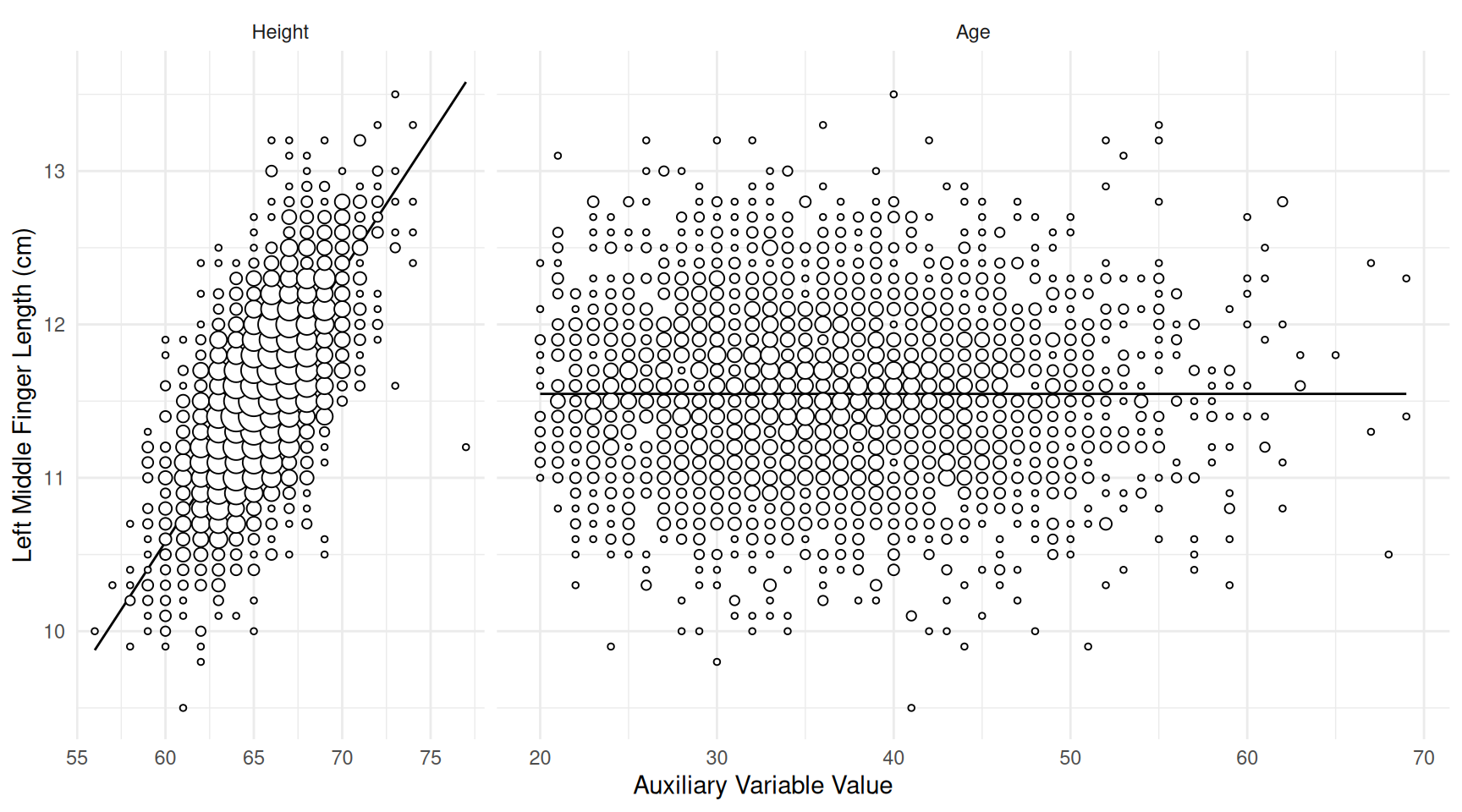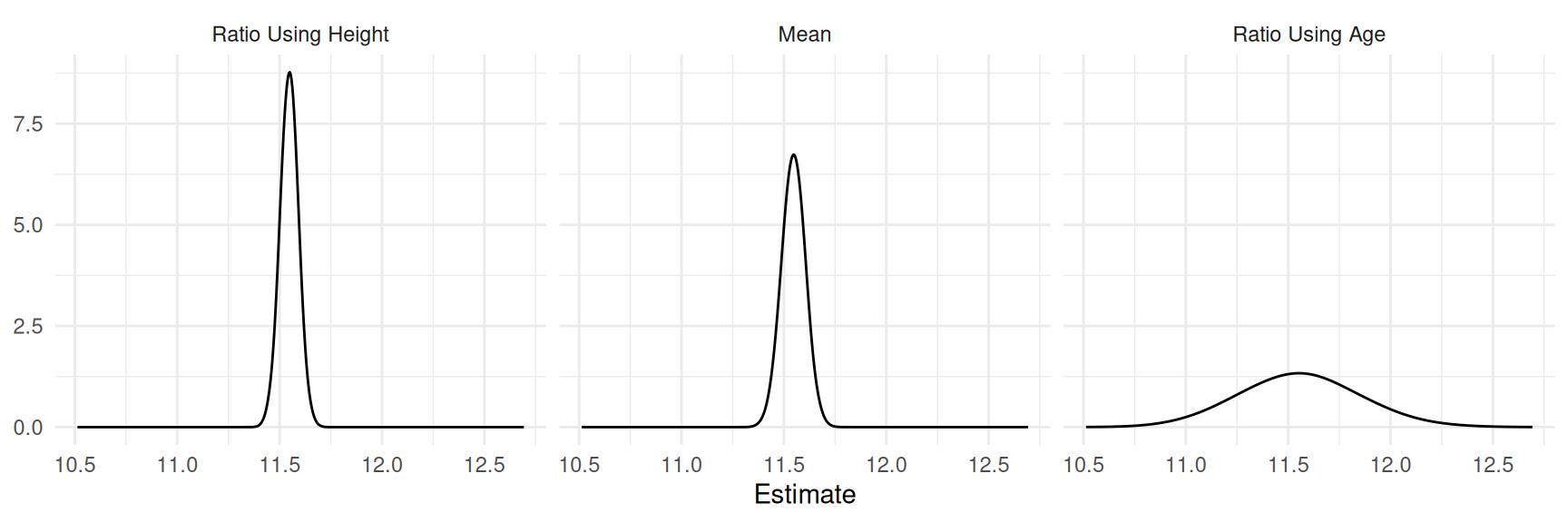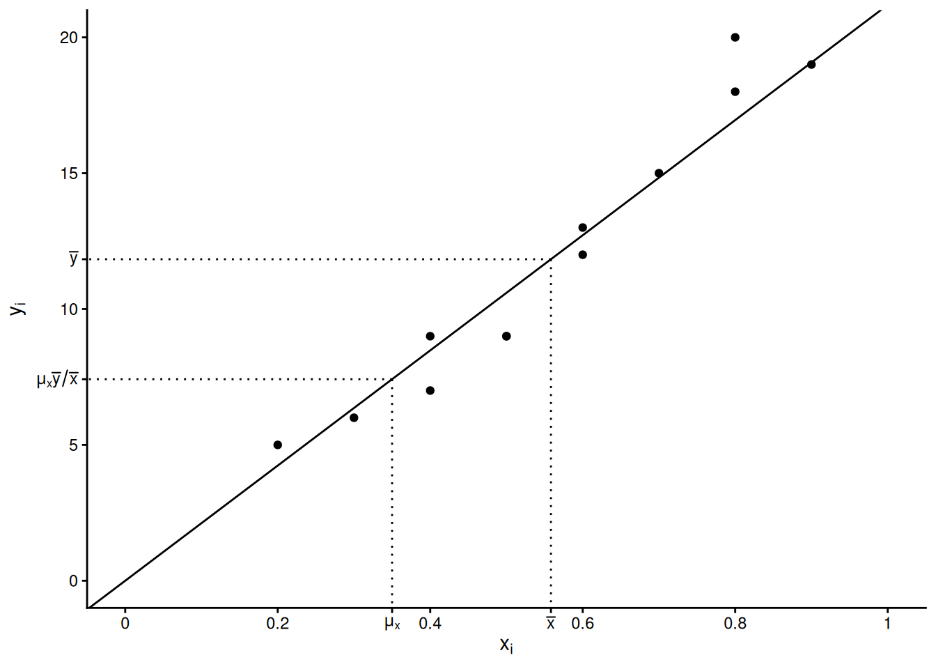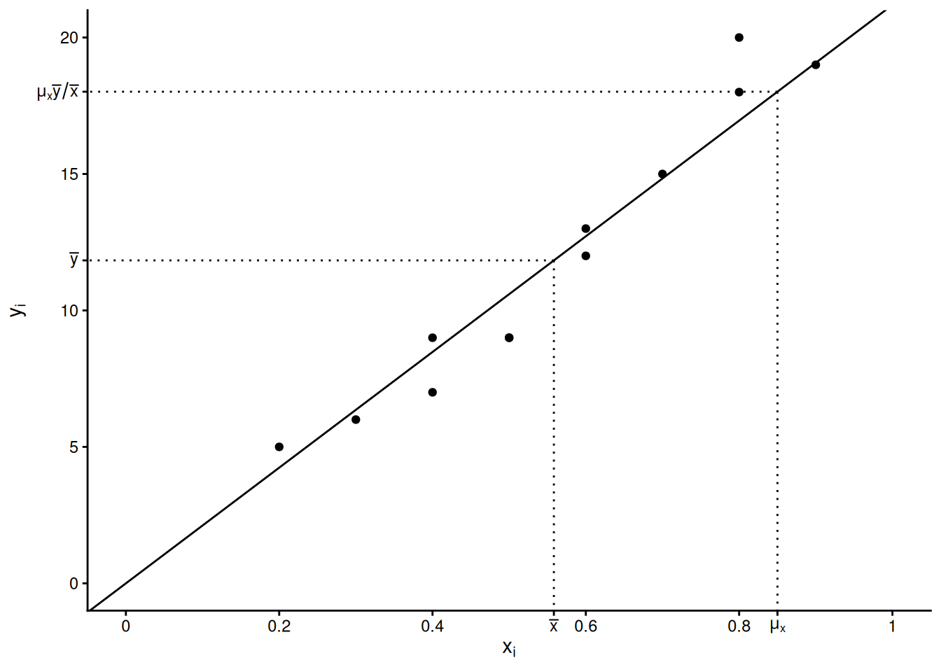 Consider two estimators of \(\mu_y\): \[ \hat\mu_y = \bar{y} \ \ \ \text{and} \ \ \ \hat\mu_y = \frac{\bar{y}}{\bar{x}}\mu_x. \] Writing the ratio estimator as \[ \hat\mu_y = \frac{\mu_x}{\bar{x}}\bar{y} \] shows more clearly that the ratio estimator “adjusts” \(\bar{y}\) by a factor of \(\mu_x/\bar{x}\). \[\begin{align*} \bar{x} < \mu_x & \Rightarrow \frac{\mu_x}{\bar{x}}>1 \Rightarrow \frac{\mu_x}{\bar{x}}\bar{y} > \bar{y} \ \ (\text{i.e., adjust estimate up}) \\ \bar{x} = \mu_x & \Rightarrow \frac{\mu_x}{\bar{x}}=1 \Rightarrow \frac{\mu_x}{\bar{x}}\bar{y} = \bar{y} \ \ (\text{i.e., no adjustment}) \\ \bar{x} > \mu_x & \Rightarrow \frac{\mu_x}{\bar{x}}<1 \Rightarrow \frac{\mu_x}{\bar{x}}\bar{y} < \bar{y} \ \ (\text{i.e., adjust estimate down}) \end{align*}\] The factor of \(\mu_x/\bar{x}\) tells us if \(\mu_x\) is underestimated or overestimated by \(\bar{x}\). This gives us some idea that might have underestimated or overestimated \(\mu_y\) as well, so we might then adjust our estimate.
