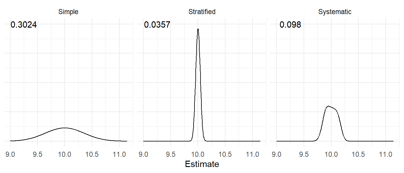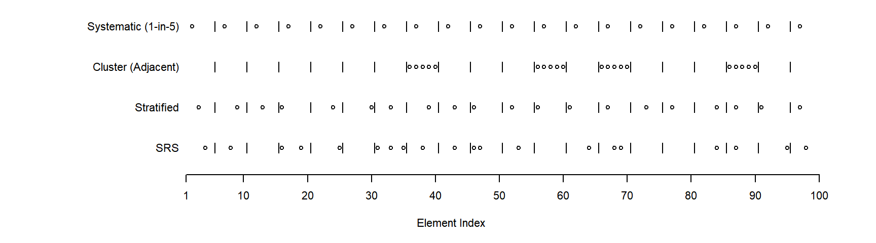 Example: A 1-in-3 systematic sample with \(M\) = 14 elements. The population is \[ \mathcal{P} = \{ \mathcal{E}_1, \mathcal{E}_2, \mathcal{E}_3 \ | \ \mathcal{E}_4, \mathcal{E}_5, \mathcal{E}_6 \ | \ \mathcal{E}_7, \mathcal{E}_8, \mathcal{E}_9 \ | \ \mathcal{E}_{10}, \mathcal{E}_{11}, \mathcal{E}_{12} \ | \ \mathcal{E}_{13}, \mathcal{E}_{14} \}, \] and the sampling units are \[\begin{align*} \mathcal{U}_1 & = \{\mathcal{E}_1,\mathcal{E}_4,\mathcal{E}_7,\mathcal{E}_{10},\mathcal{E}_{13}\}, \\ \mathcal{U}_2 & = \{\mathcal{E}_2,\mathcal{E}_5,\mathcal{E}_8,\mathcal{E}_{11},\mathcal{E}_{14}\}, \\ \mathcal{U}_3 & = \{\mathcal{E}_3,\mathcal{E}_6,\mathcal{E}_9,\mathcal{E}_{12}\}. \end{align*}\]
