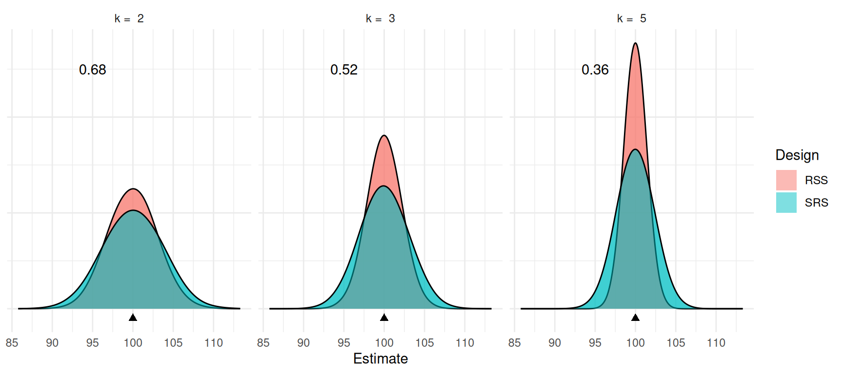 The design effect of RSS has the property that \[ \frac{2}{k+1} \le \frac{V_{\small \text{RSS}}(\bar{y})}{V_{\small \text{SRS}}(\bar{y})} \le 1, \] and tends to be closer to \(2/(k+1)\), particularly in cases where the population distribution is nearly symmetric.