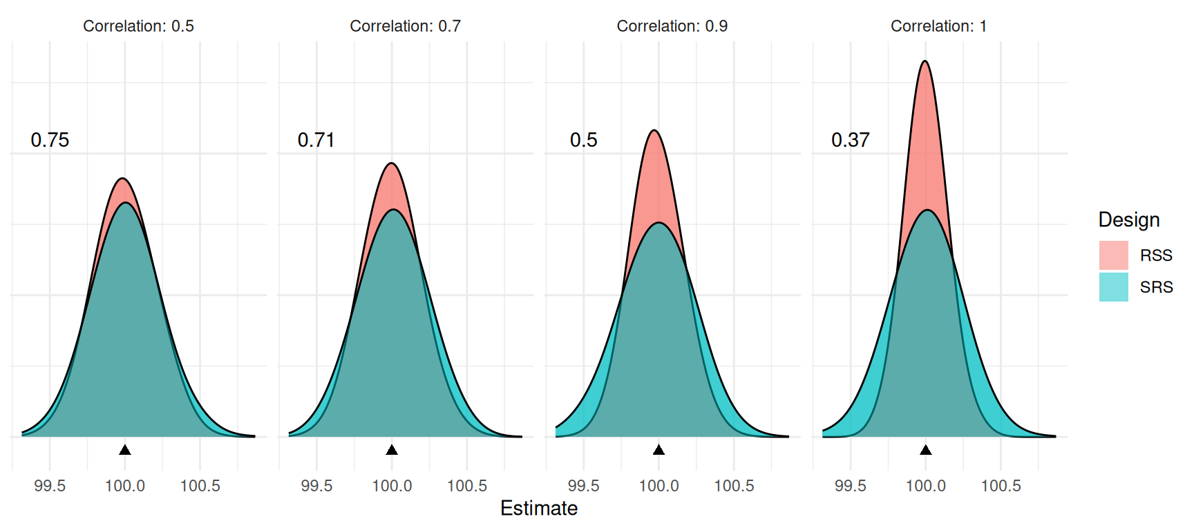 Note: The number shown in each graph is the design effect of the ranked set sampling design.