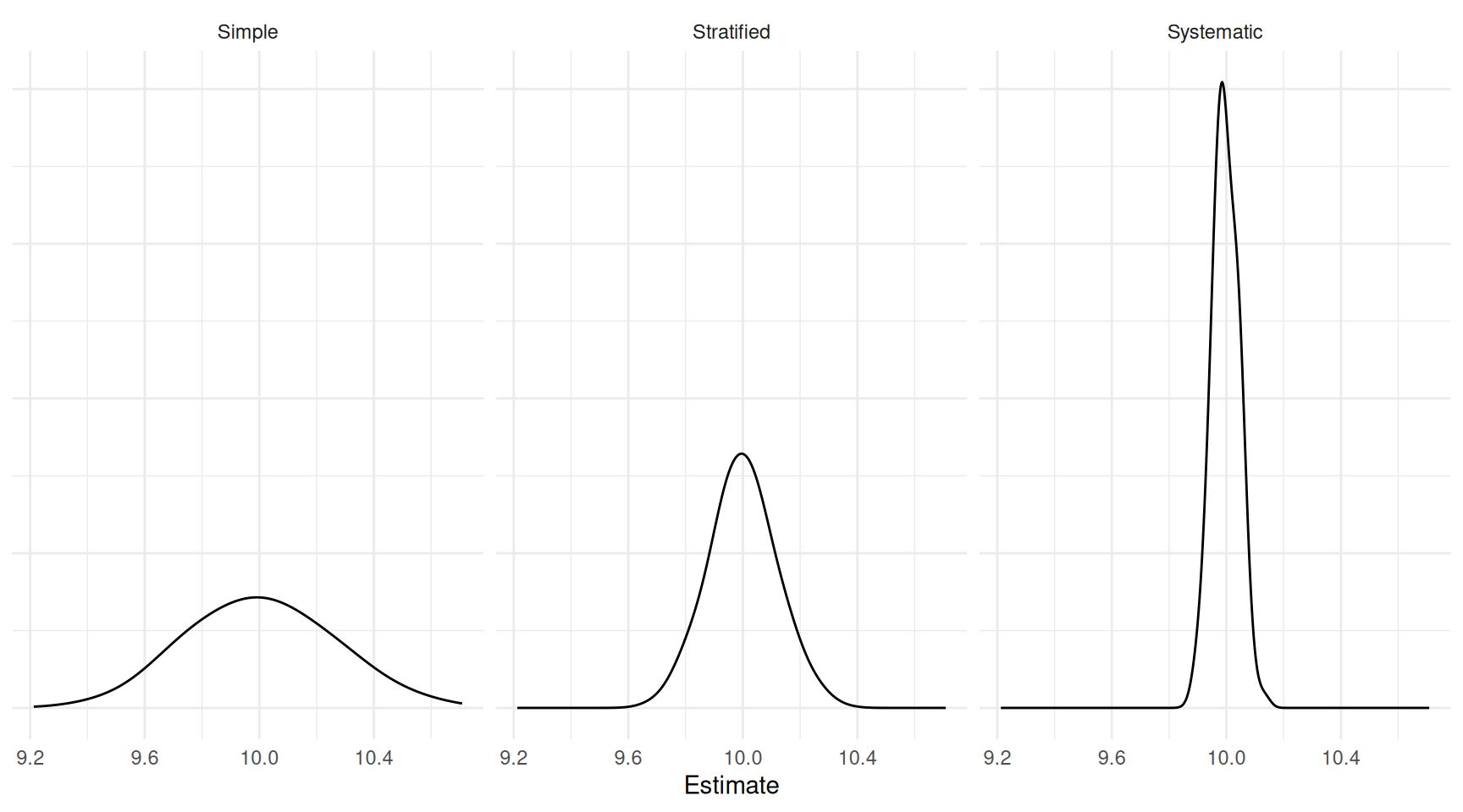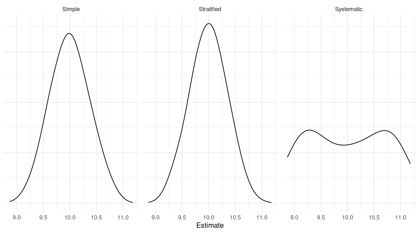 Repeated systematic sampling simply involves selecting multiple 1-in-\(k\) samples, each of which is a cluster. This is also a good way to simply increase the number of elements sampled.