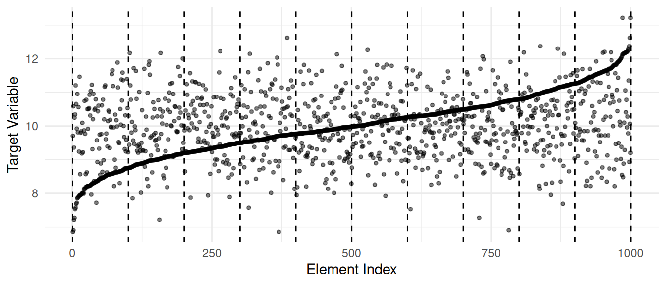 Let \(y_{(i)j}\) denote the value of the target variable for the element ranked \(i\)-th in the \(j\)-th set. That is, we assume that \[ y_{(1)j} \ge y_{(2)j} \ge \cdots \ge y_{(k)j}, \] or \[ y_{(1)j} \le y_{(2)j} \le \cdots \le y_{(k)j}, \] for all \(k\) sets (direction of ranking doesn’t matter provided it is the same for all sets).