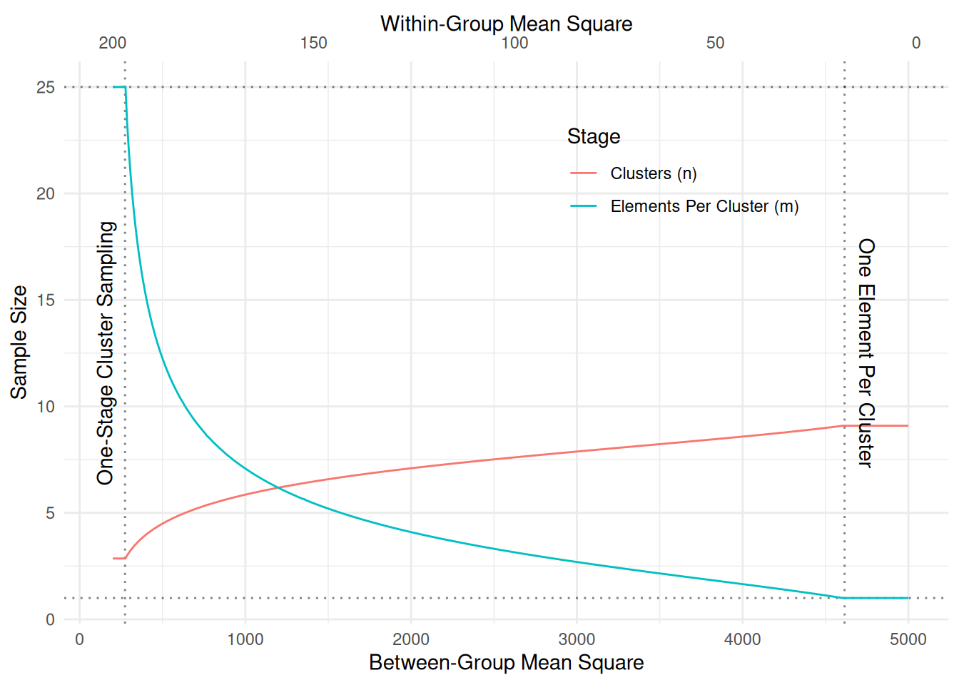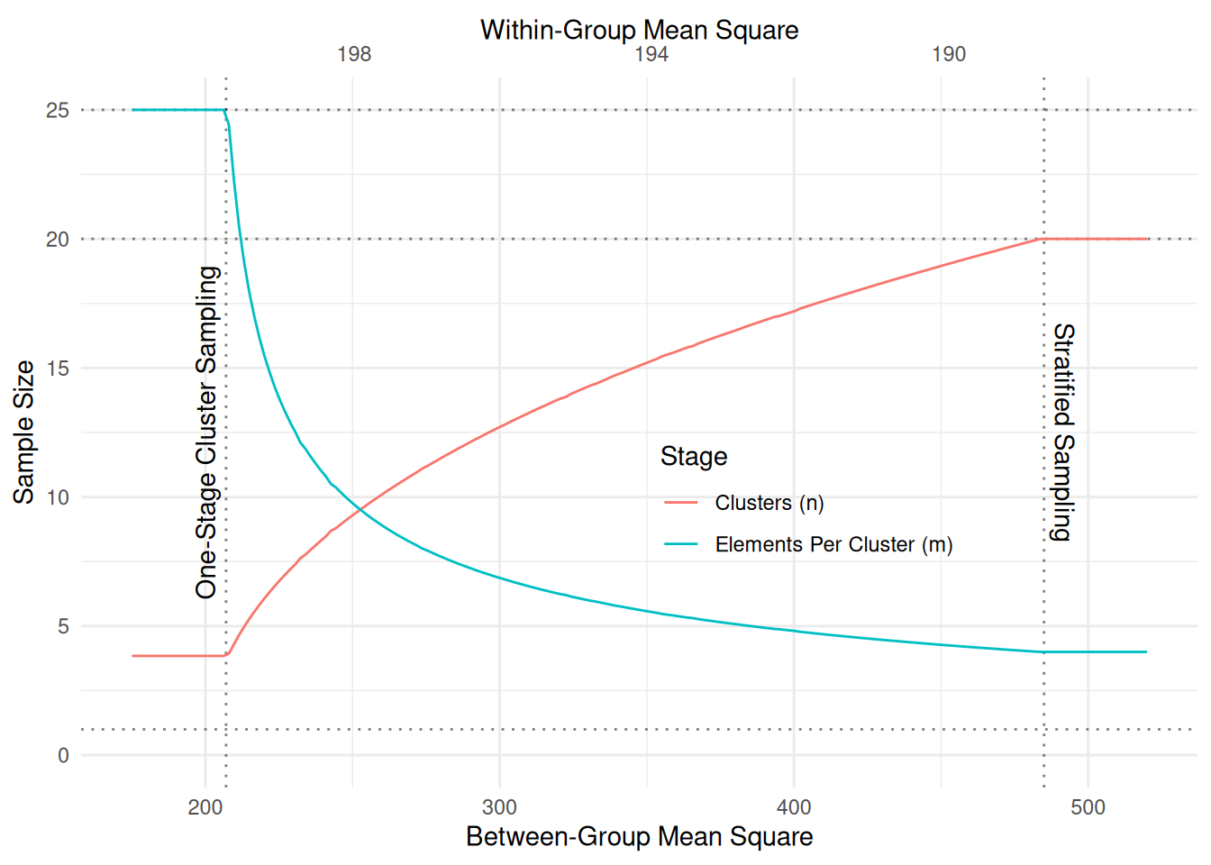 The sample size for the number of clusters (\(n\)) to minimize the variance for a fixed cost is \[ n_{\text{opt}} = \frac{C}{c_1 + c_2m_{\text{opt}}}. \] Note: Clearly we must have \(1 \le n \le N\).