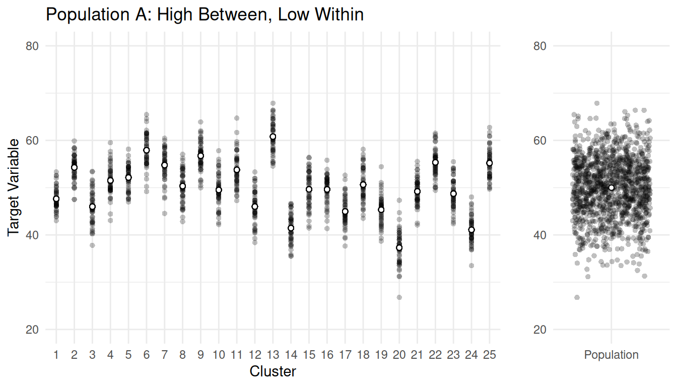 between-group and within-group mean squares for a population of \(N\) = 100 clusters with \(\bar{M}\) = 25 elements in each cluster.
