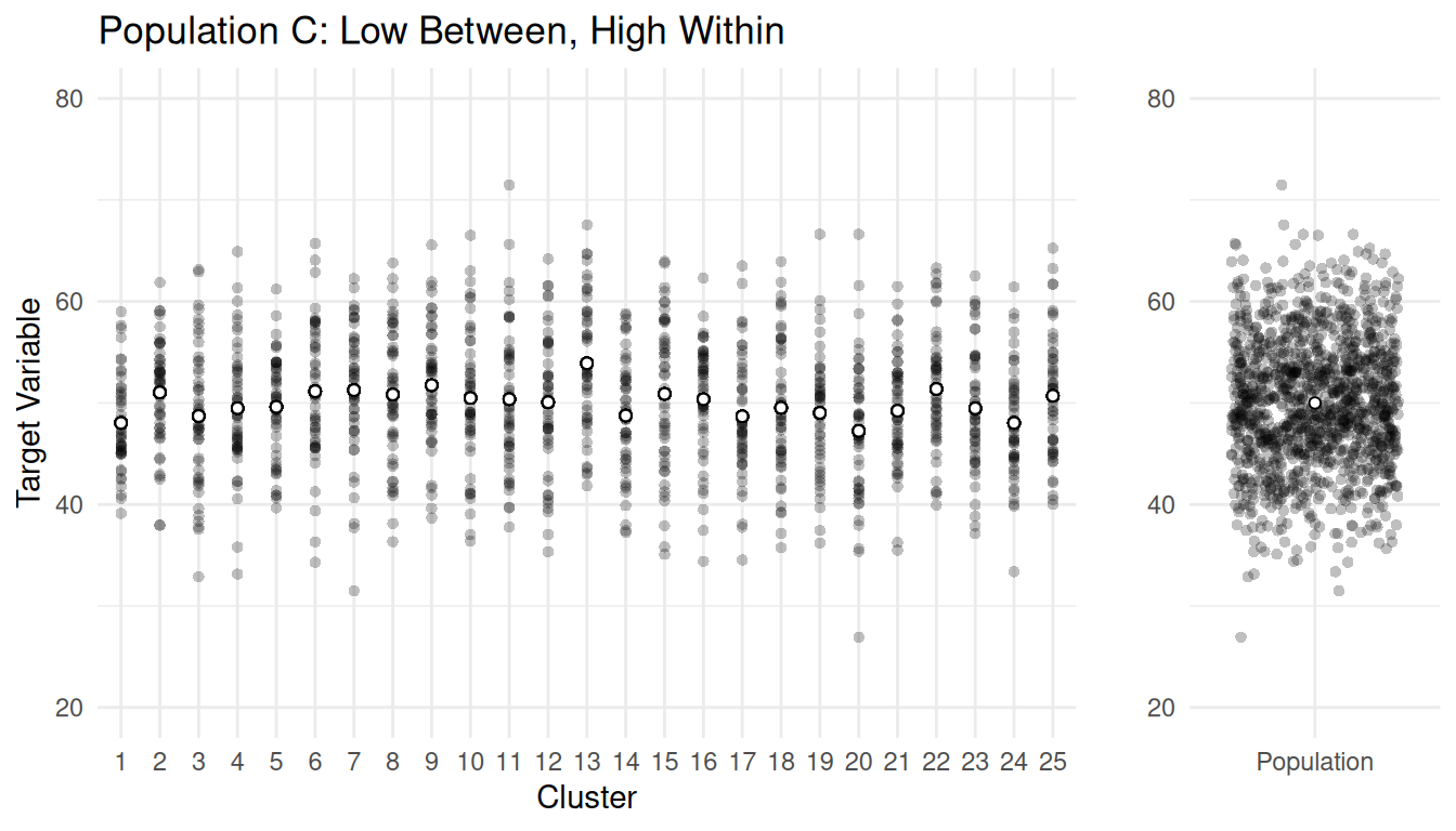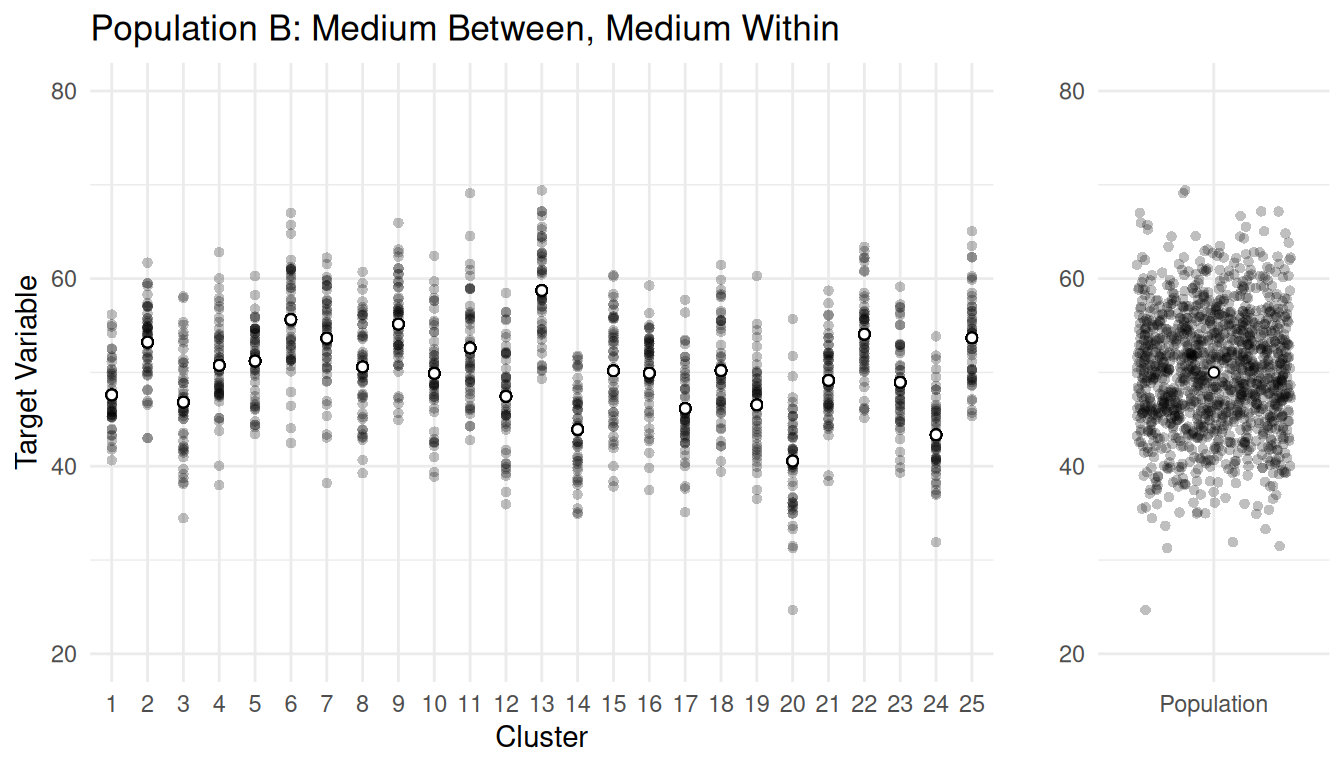 Example: Consider populations with \(M\) = 1250 elements in \(N\) = 25 clusters, each of size \(\bar{M}\) = 50.