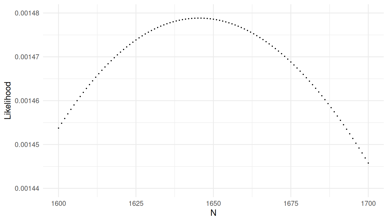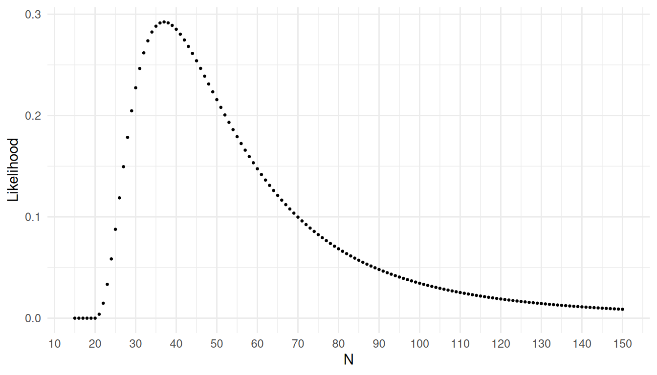 The likelihood function is the probability of a sample with \(m\) marked elements as a function of the unknown parameter \(N\), which can be written as \[ L(N) = \frac{\binom{\tau_x}{m}\binom{N-\tau_x}{n-m}}{\binom{N}{n}}. \] The maximum likelihood estimate of \(N\) is the value that maximizes the likelihood of the data.