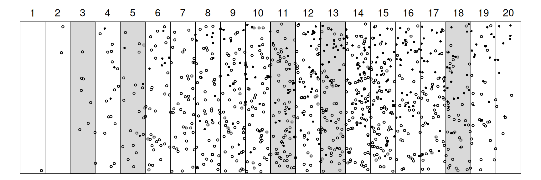Example: Consider a design with multiple recaptures such that every time elements are captured all unmarked elements are marked and then released. Let \(\tau_{x_k}\) be the number of marked elements in the population when obtaining the \(k\)-th sample, let \(n_k\) be the size of the \(k\)-th sample, and let \(m_k\) be the number of marked elements in the \(k\)-th sample.| \(k\) | \(\tau_{x_k}\) | \(n\) | \(m\) | \(n-m\) |