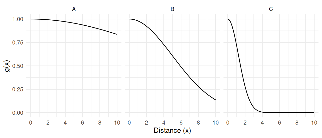 Assume perfect detection at a distance of \(x\) = 0 so that \(g(0)\) = 1.