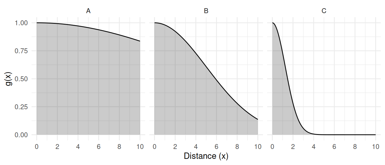 Informal proof: The distribution of distances of detected elements is \[ f(x|\text{detected}) = \frac{P(\text{detected}|x)u(x)}{P(\text{detected})}, \] where \(u(x)\) is the distribution of distances (detected or not). Now \(P(\text{detected}|x) = g(x)\), and \(P(\text{detected})\) is the detectability, \[ P(\text{detected}) = \frac{1}{w}\int_0^w\!\! g(x) dx, \] and because transects are located randomly, \(u(x) = 1/w\). Thus, \[ f(x|\text{detected}) = \frac{g(x)/w}{\frac{1}{w}\int_0^w\!\! g(x) dx} = \frac{g(x)}{wP(\text{detected})}. \] But since \(g(0) = 1\), if evaluate this function at \(x = 0\) we have \[ f(0|\text{detected}) = \frac{1}{wP(\text{detected})} \] which implies that \[ P(\text{detected}) = \frac{1}{wf(0|\text{detected})}. \]