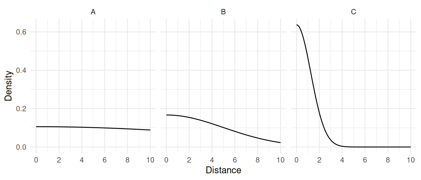 In many cases detectability may be a function of some other variable. The method of distance sampling assumes that detectability is a function of distance from the observer to the element. The explanation of how distance sampling works involves some probability theory and is fairly technical. Some of the details are given here for those that might be interested. But the implementation of distance sampling is relatively straight forward.