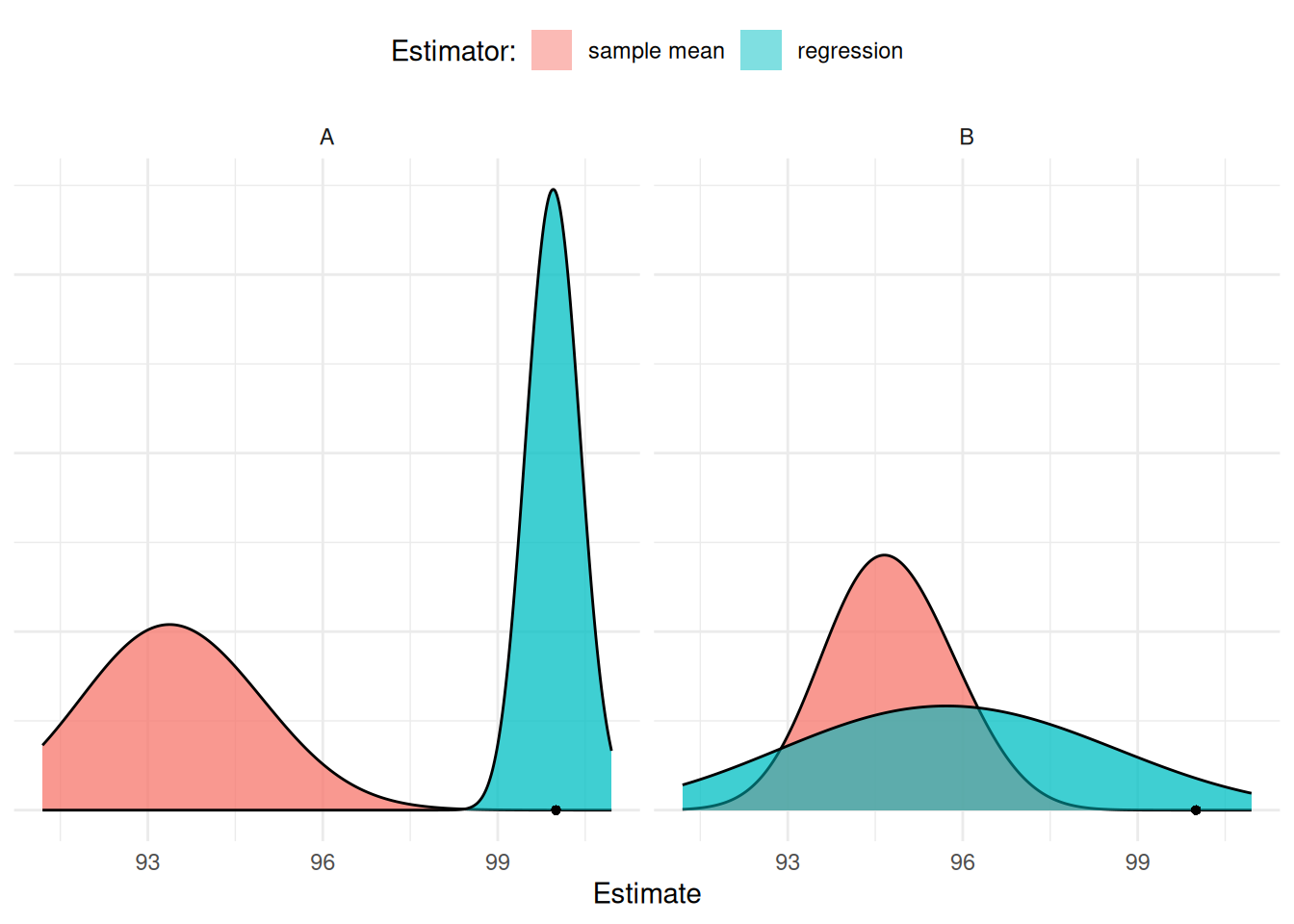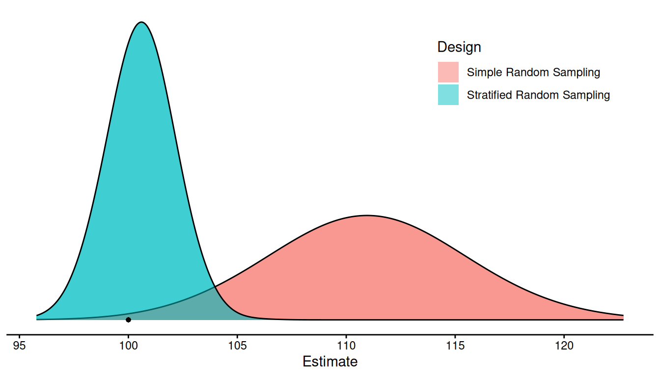 Now consider two designs to estimate \(\mu\): simple random sampling and
