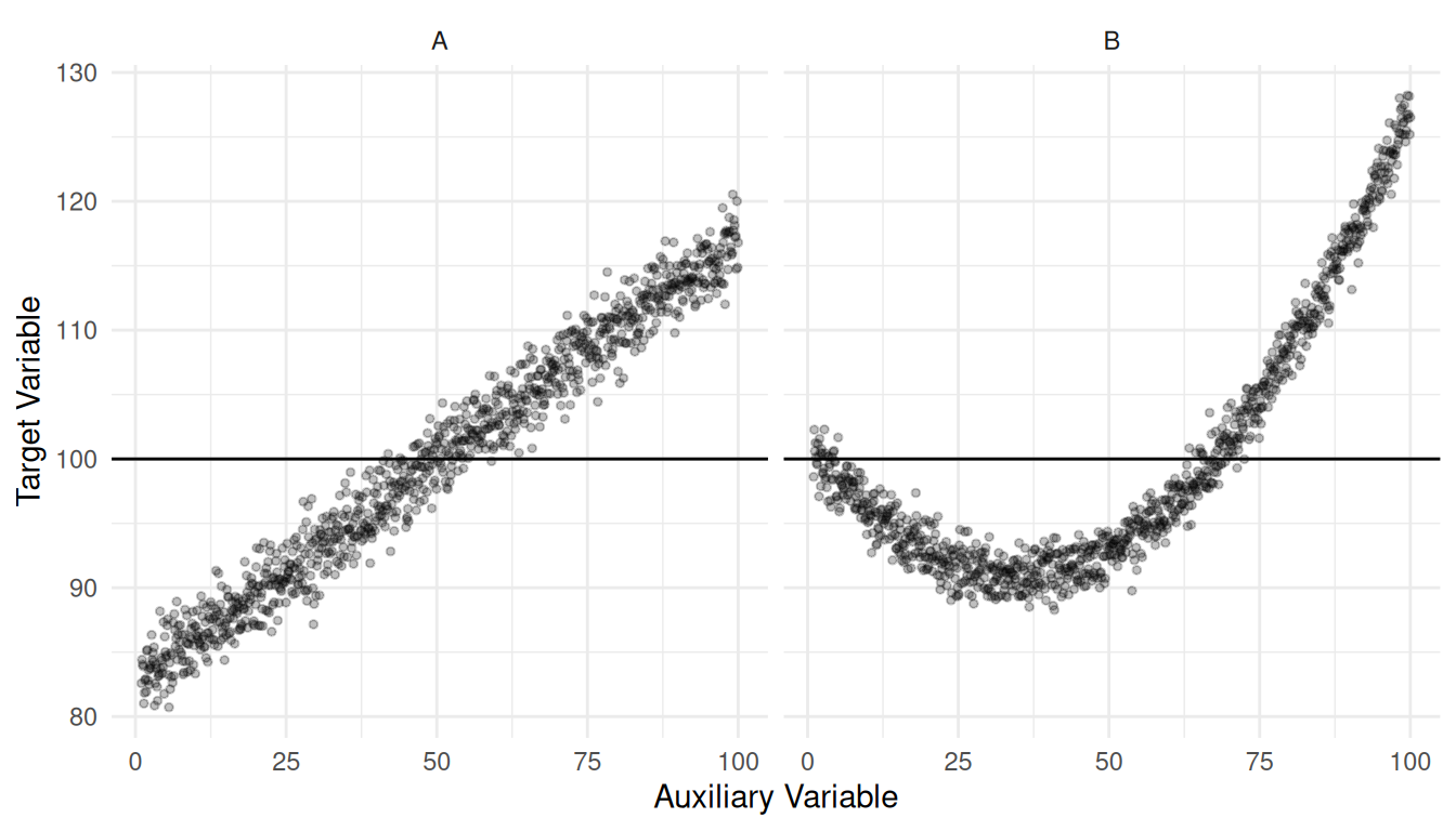 Example: The following plot shows two populations. In both populations \(\mu\) = 100 and the probability of non-response increases with the value of the auxiliary variable.