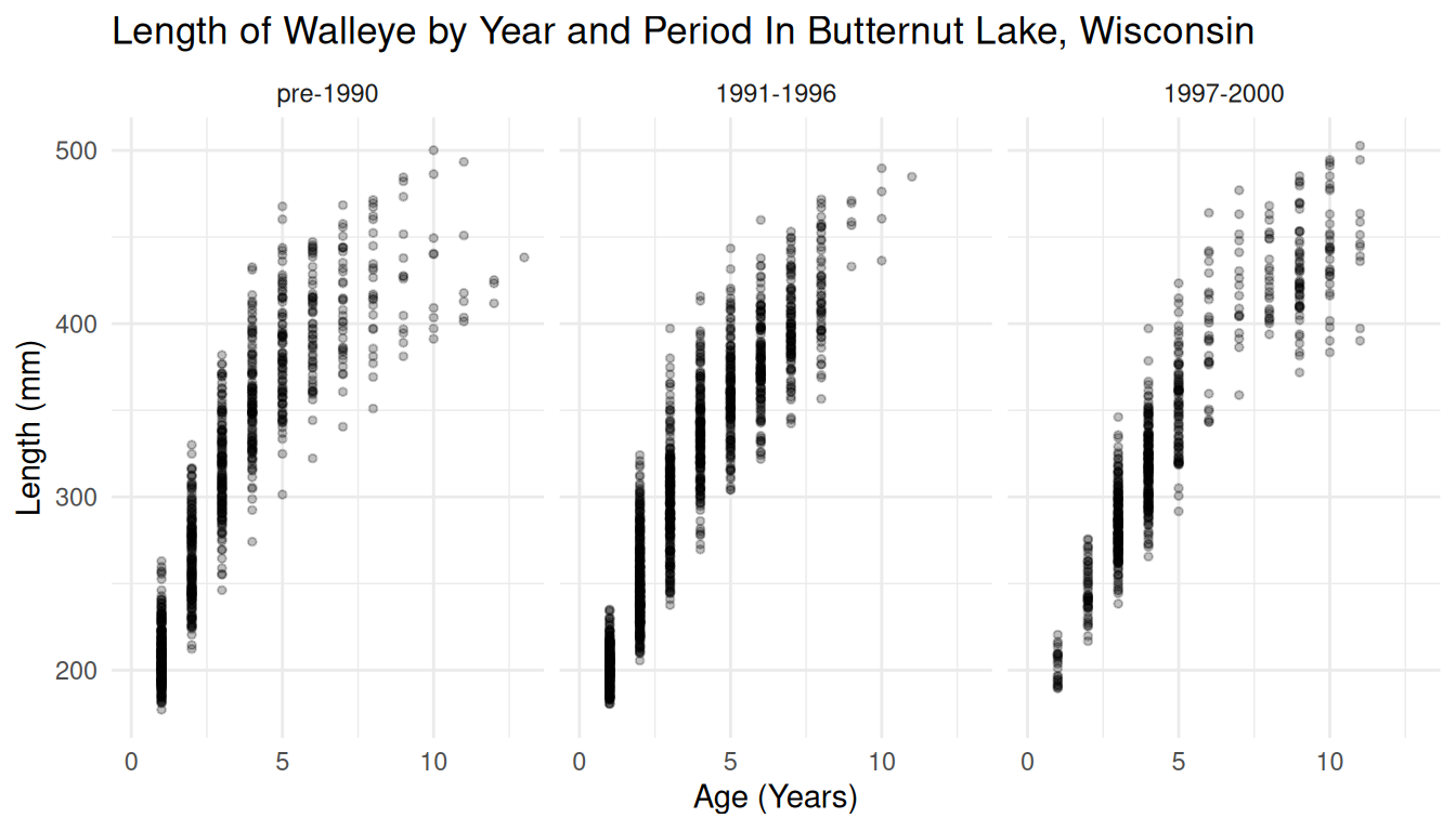Example: These are data on 3198 walleye captured in Butternut Lake, Wisconsin, during three periods with different management methods in place.