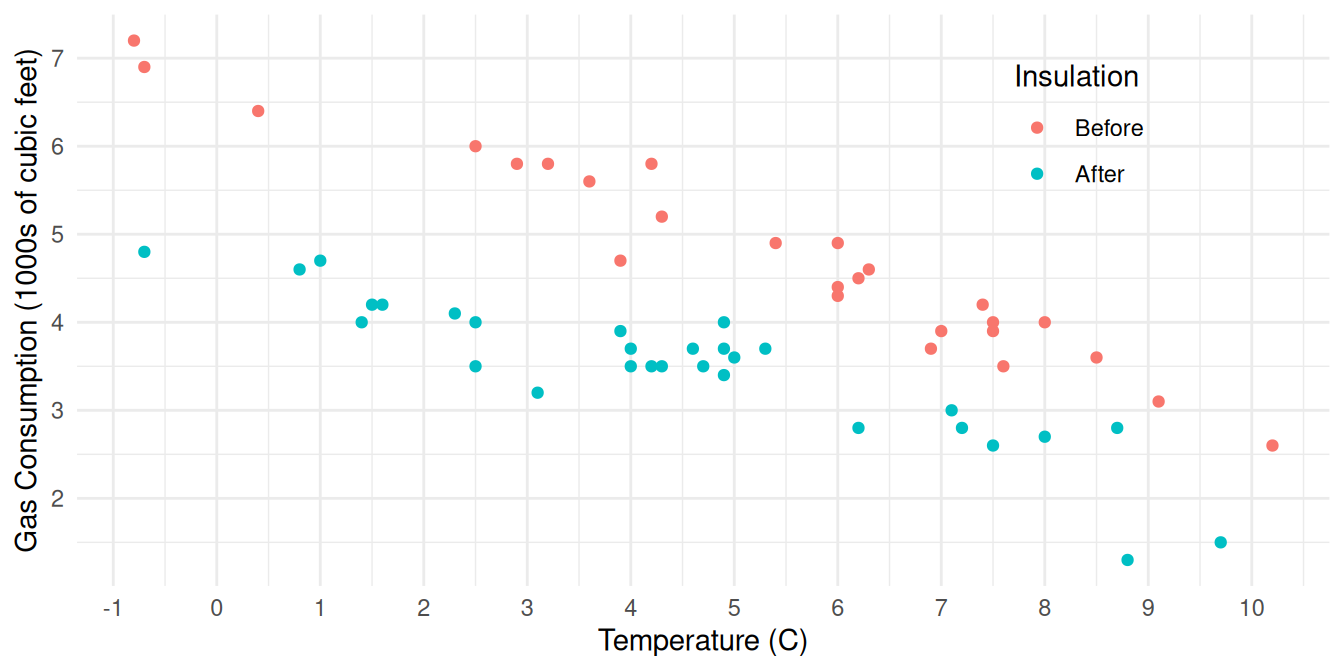 (0,0,1,0),0 -0.3932 0.02249 -0.4384 -0.3481 -17.49 52 1.976e-23The rate of change in expected gas consumption after insulation is \(\beta_2 + \beta_3\).