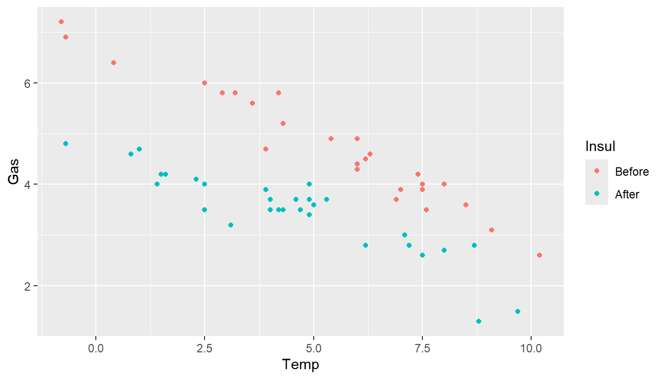 p <- ggplot(whiteside, aes(x = Temp, y = Gas, color = Insul)) + geom_point() +
