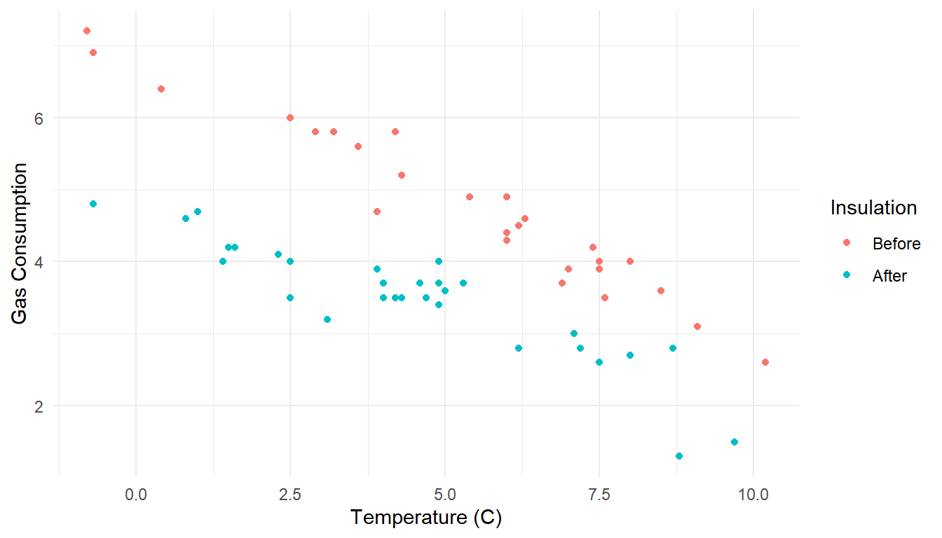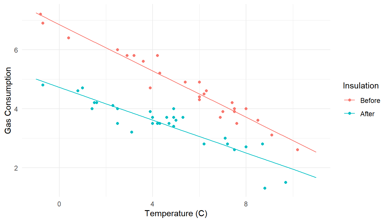 labs(x = "Temperature (C)", y = "Gas Consumption", color = "Insulation") +