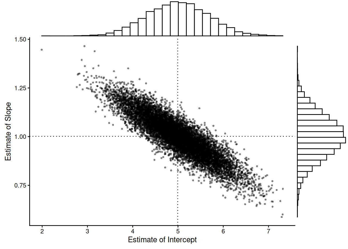 Example: Consider the model \(E(Y_i) = \beta_0 + \beta_1 x_i\) where \(x_1\) = 1, \(x_2\) = 2, \(\dots\), \(x_{10}\) = 10, \(\beta_0\) = 5, \(\beta_1\) = 1, and \(\sigma\) = 1. The figure below shows the distribution of \(\hat\beta_0\) and \(\hat\beta_1\) from 10000 samples of observations of \(Y_1, Y_2, \dots, Y_{10}\).