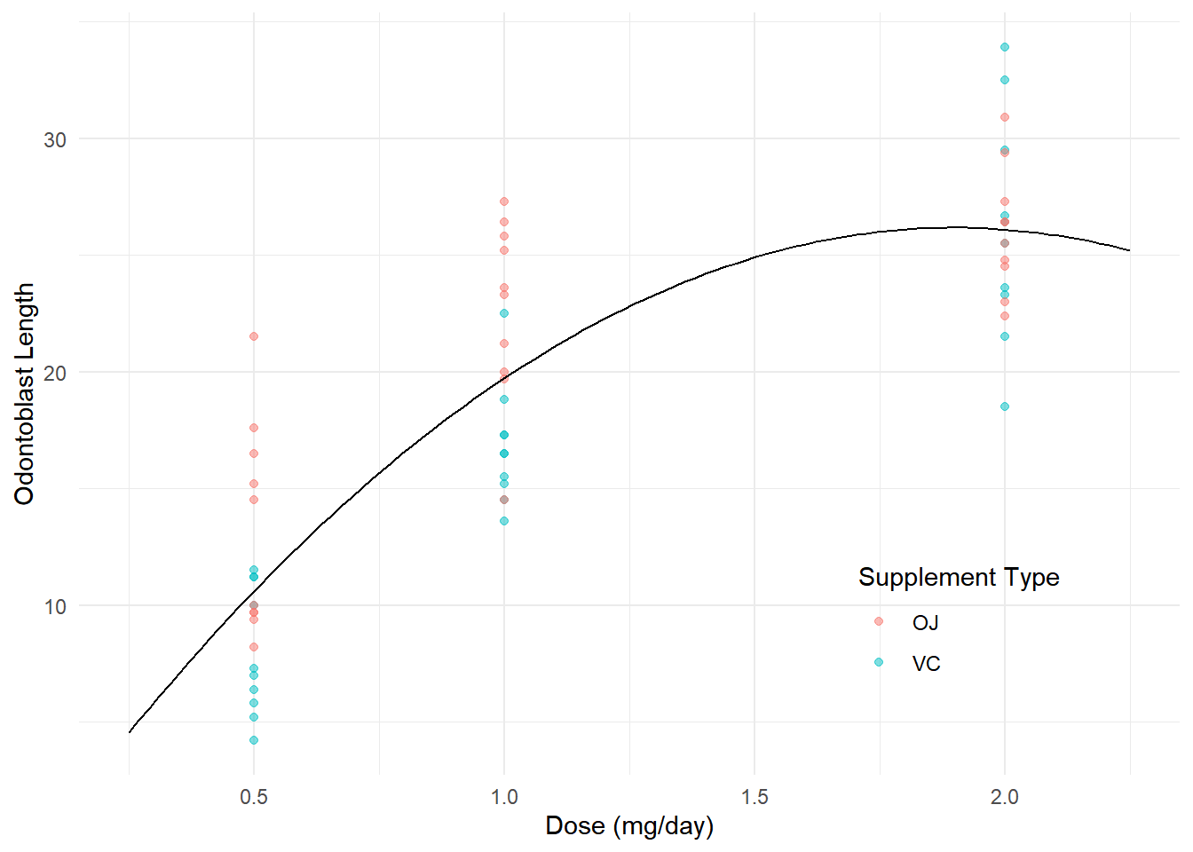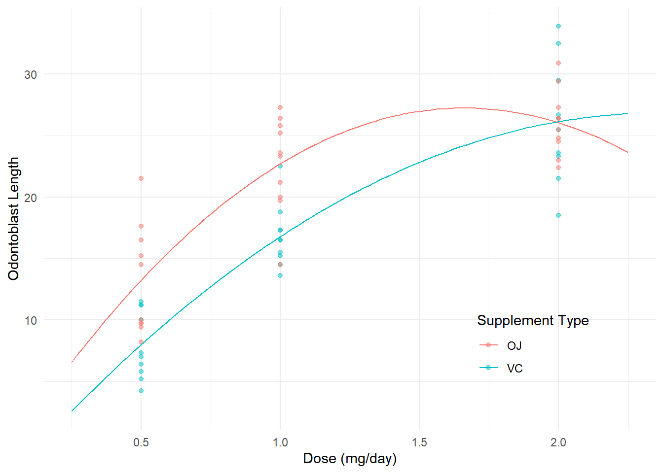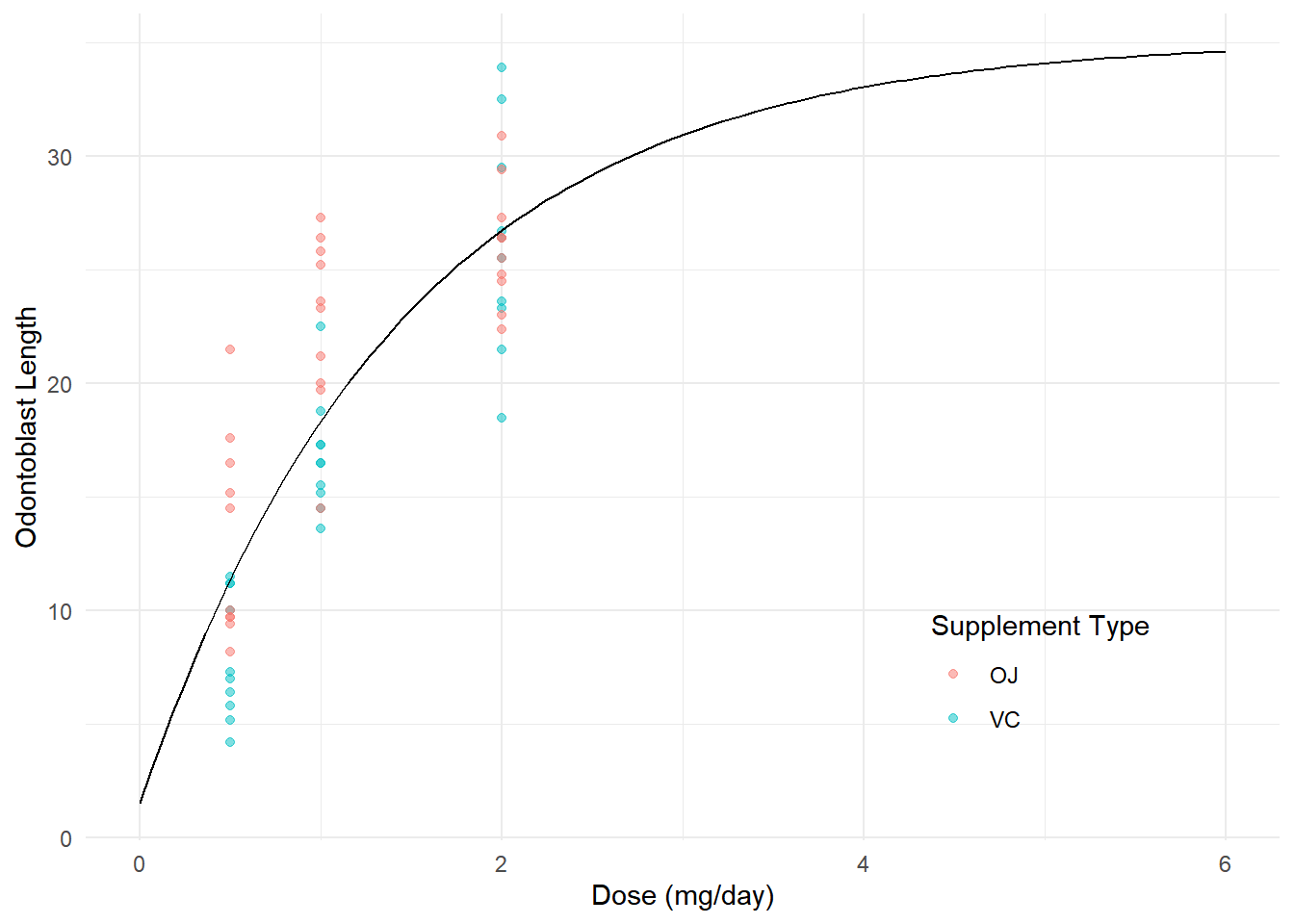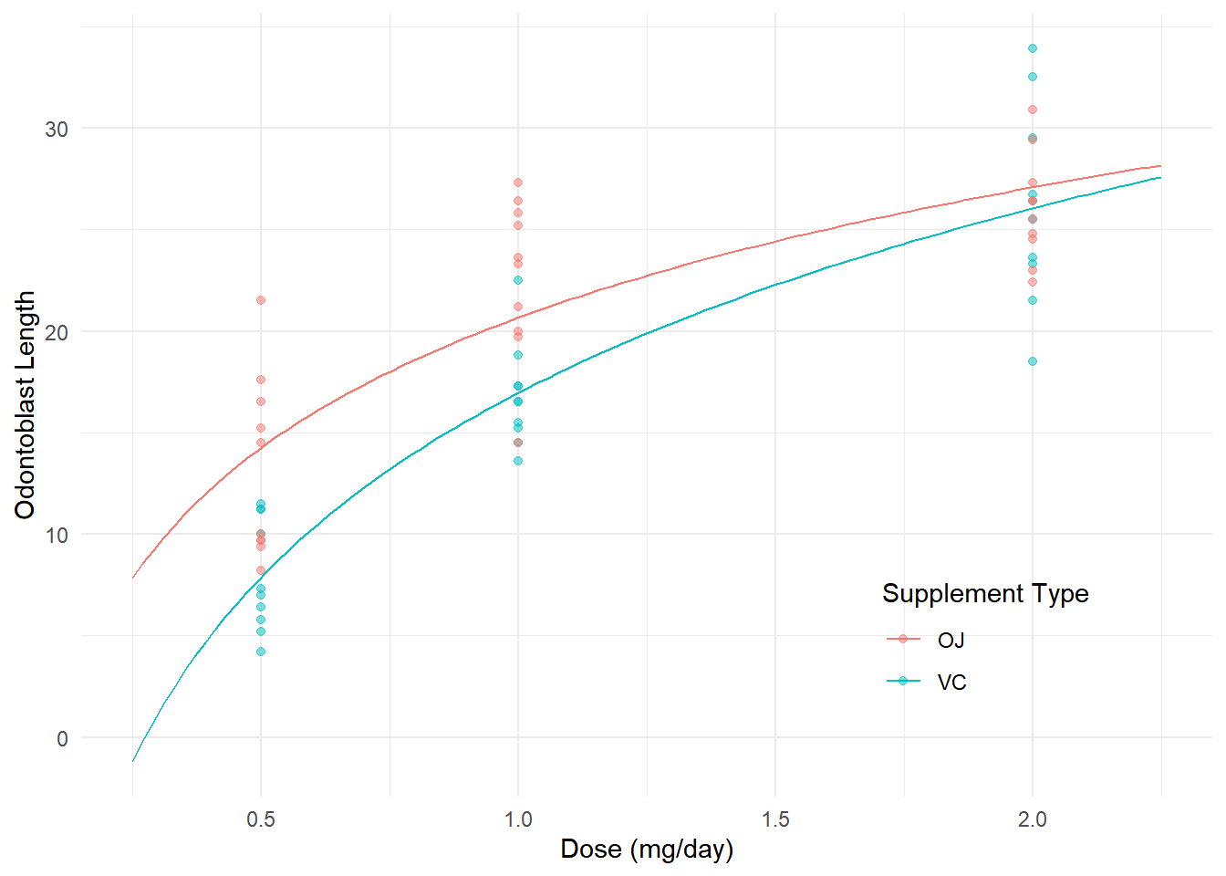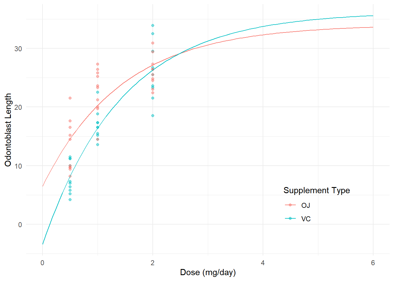 But wouldn’t it make sense to have something like the following? \[ E(Y_i) = \begin{cases} \beta_0 + \beta_12^{-x_i/h_{\text{OJ}}}, & \text{if the supplement type of the $i$-th observation is OJ}, \\ \beta_0 + \beta_12^{-x_i/h_{\text{VC}}}, & \text{if the supplement type of the $i$-th observation is VC}, \end{cases} \] because at \(x = 0\) and as \(x \rightarrow \infty\) there should be no difference in the supplement type, but there might be a difference in how “fast” the expected response increases with dose. But unless we know \(h_{\text{OJ}}\) and \(h_{\text{VC}}\), this model would be nonlinear (i.e., the model is not linear if \(h_{\text{OJ}}\) and \(h_{\text{VC}}\) are unknown parameters as opposed to known values).