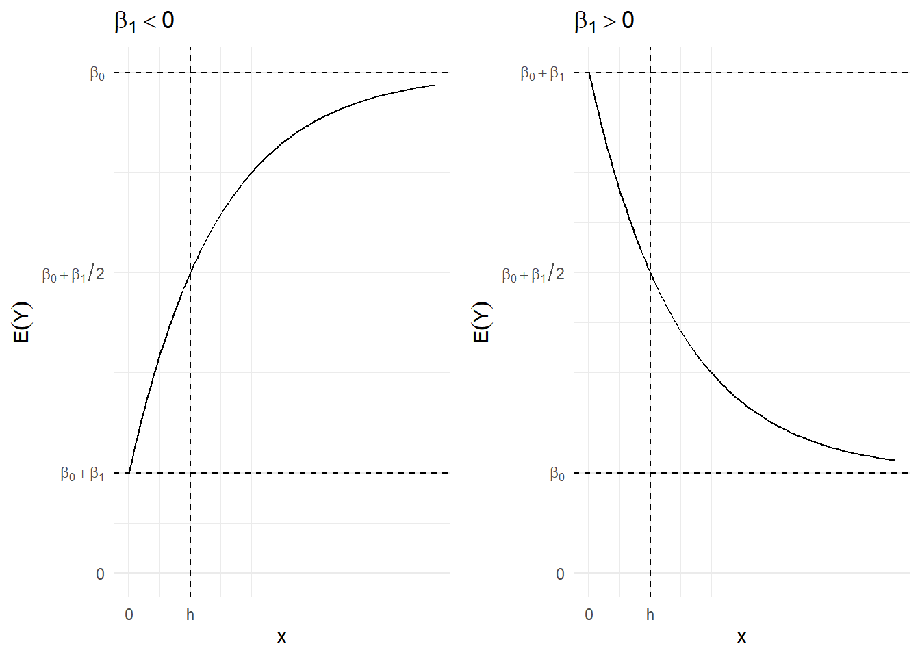 As \(x\) increases then \(E(Y)\) approaches an asymptote of \(\beta_0\). This is an upper (if \(\beta_1 < 0\)) or lower (if \(\beta_1 > 0\)) asymptote.1