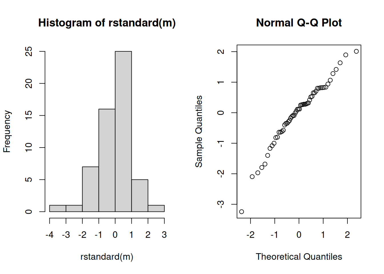 Detection: Plots of standardized or studentized residuals can reveal severe non-normality. Histograms can be used, but quantile-quantile (qq) plots are preferred. A qq-plot is a plot of the sorted residuals against their expected “order statistics” under the assumption that they are normally-distributed.