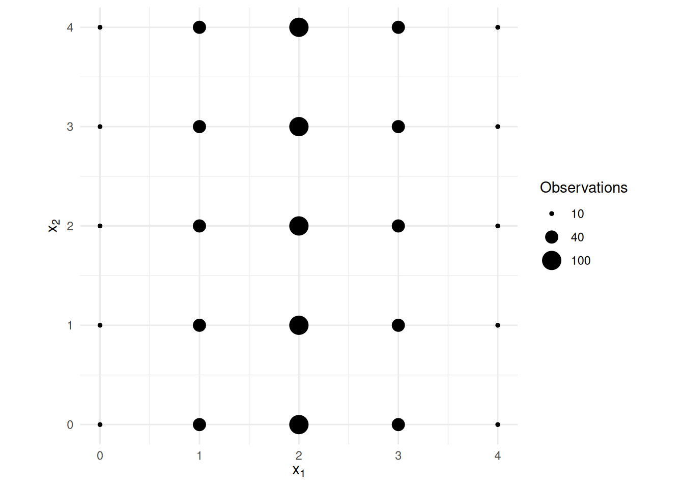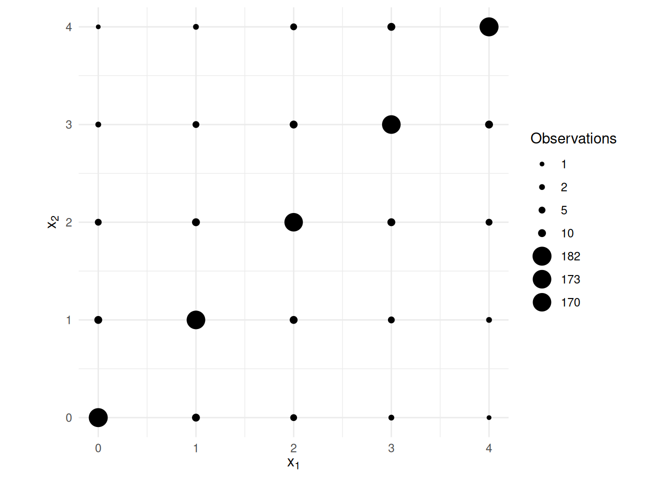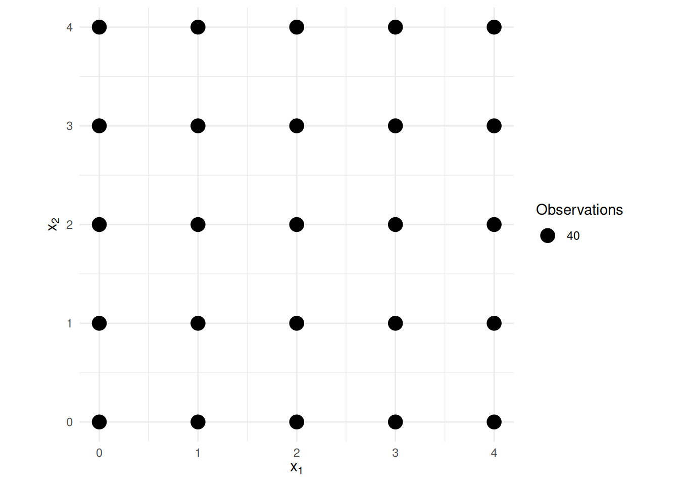 This last example illustrates what is called (multi)collinearity where there exist \(\lambda_0, \lambda_1, \lambda_2, \dots, \lambda_k\) (other than that all \(\lambda_0, \lambda_1, \lambda_2, \dots, \lambda_k\) equal zero) such that \[ \lambda_0 + \lambda_1x_{i1} + \lambda_2x_{i2} + \cdots + \lambda_kx_{ik} \approx 0 \] for all observations. Another way to say this is that we could almost determine the value of one explanatory variable from the others using a linear model where that explanatory variable is the response variable. When there are only two explanatory variables involved this will be evident from a high correlation (in absolute value) between those two explanatory variables.