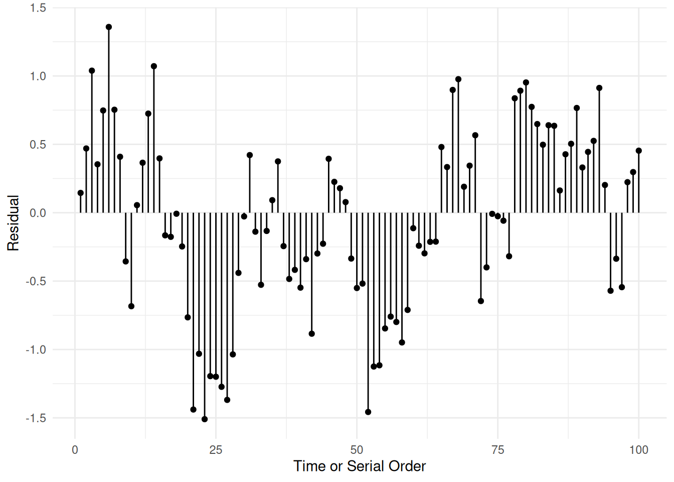 In the regression model \[ Y_i = f(x_{i1}, x_{i2}, \dots, x_{ik}) + \epsilon_i, \] it is assumed that \(\epsilon_1, \epsilon_2, \dots, \epsilon_n\) are mutually independent. Equivalently, it is assumed that \(Y_1, Y_2, \dots, Y_n\) are conditionally independent given \(x_{i1}, x_{i2}, \dots, x_{ik}\). That is, the distribution of any one \(\epsilon_i\) (or \(Y_i\)) should not depend on the values of the other \(\epsilon_{i'}\) (or \(Y_{i'}\)) (\(i' \neq i\)).