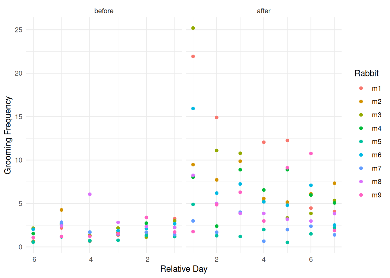 labs(x = "Relative Day", y = "Grooming Frequency",