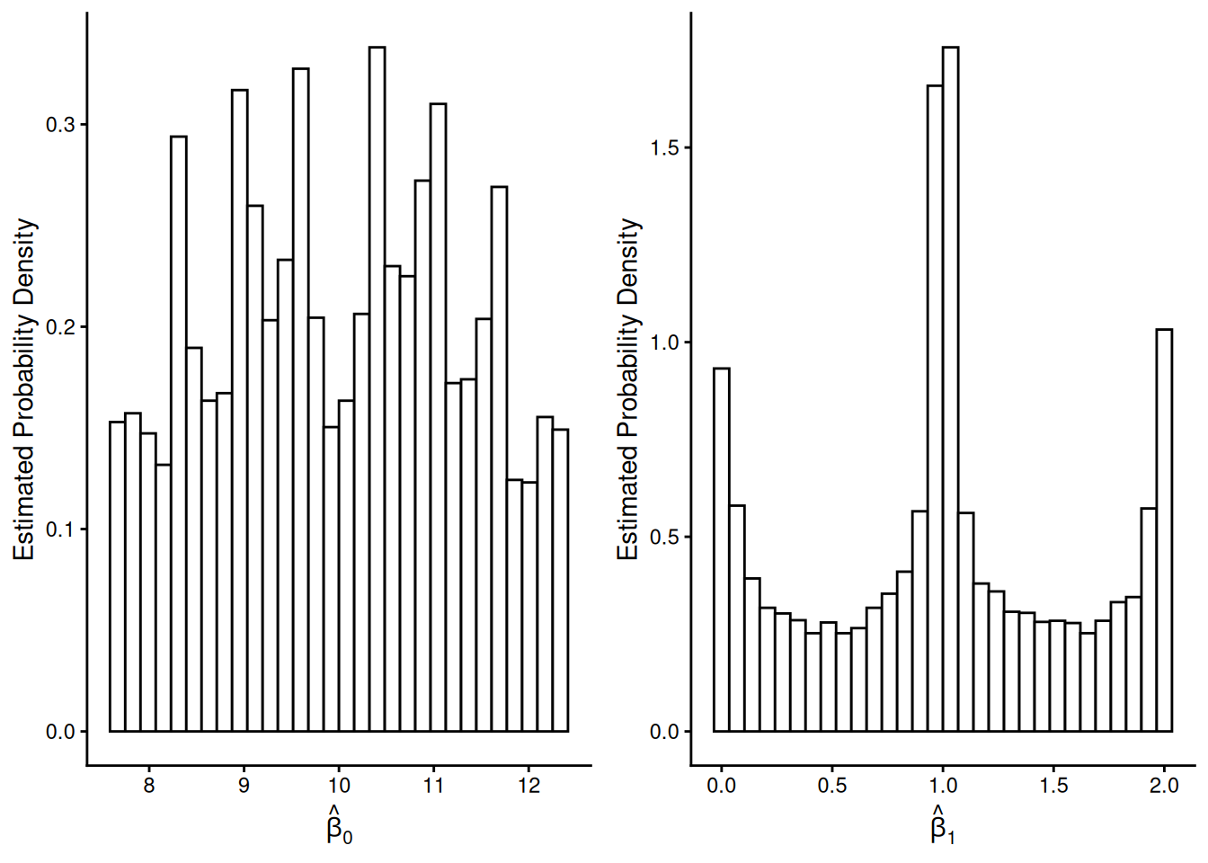 Consequences: Confidence/prediction intervals and p-values may not be accurate if the distribution of \(\epsilon_i\) (or \(Y_i\)) is very non-normal, but only if \(n\) is very small relative to the number of parameters (\(p\)). This is because under fairly general circumstances as \(n \rightarrow \infty\) the sampling distribution of the model parameters (and functions thereof) “approach” a normal distribution (i.e., “asymptotically normal”) regardless of the distribution of the error/response. With the exception of prediction intervals, we only require that sampling distributions are (approximately) normal.