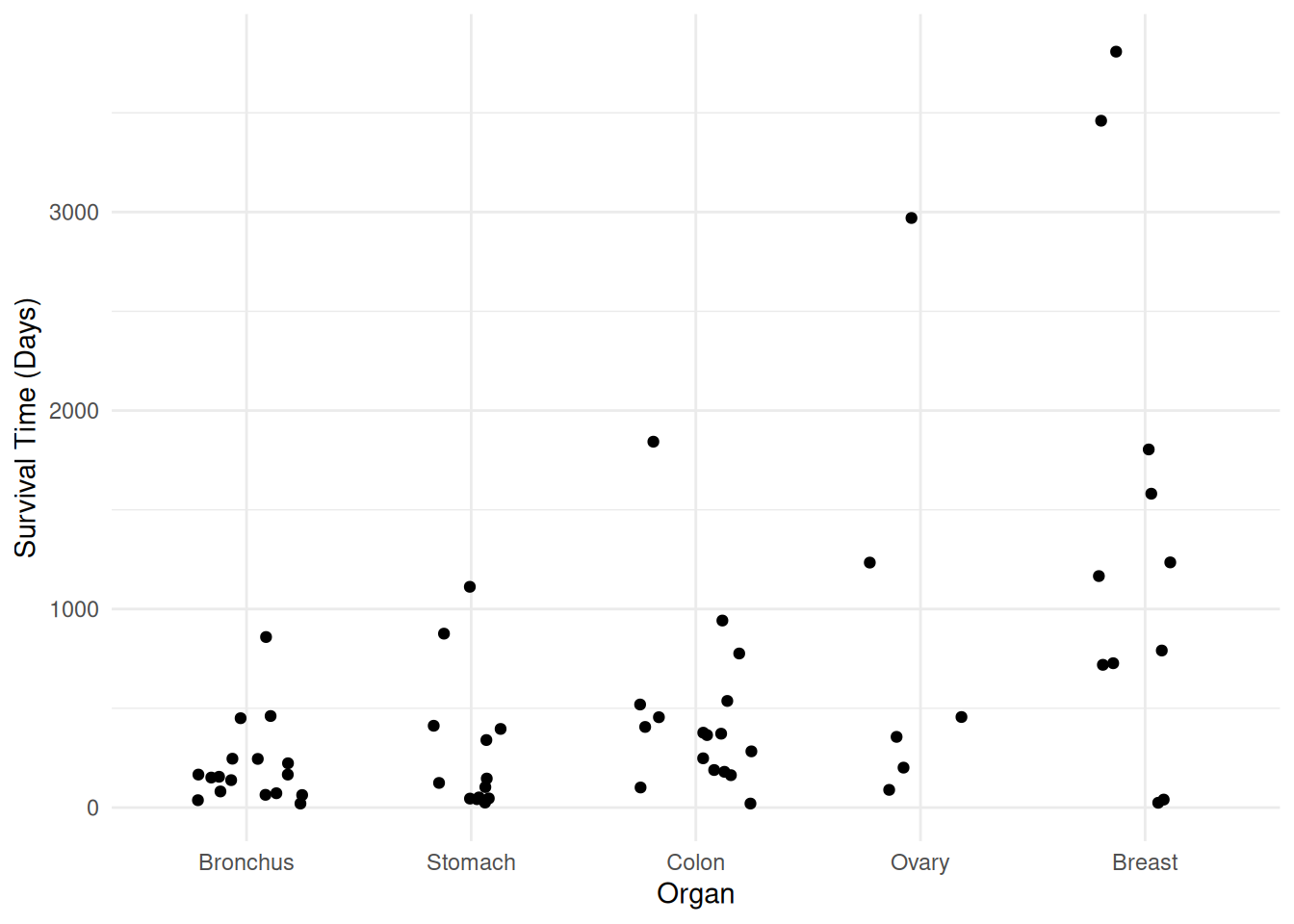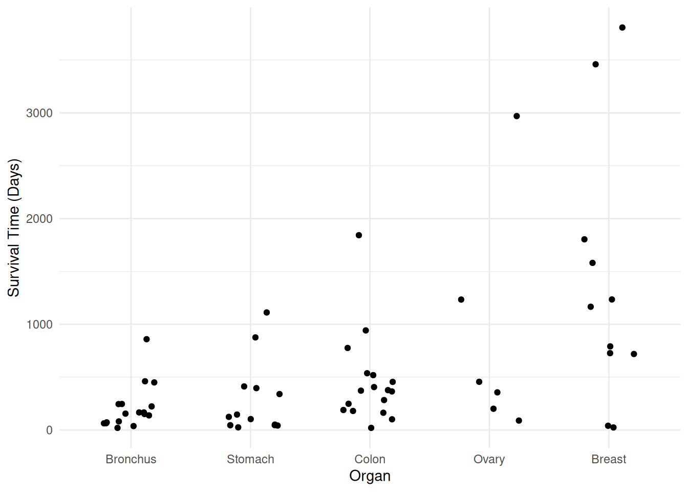 p <- ggplot(CancerSurvival, aes(x = Organ, y = Survival)) +
