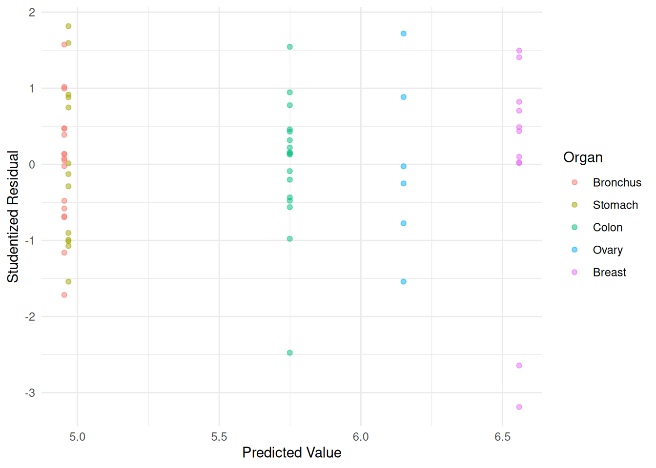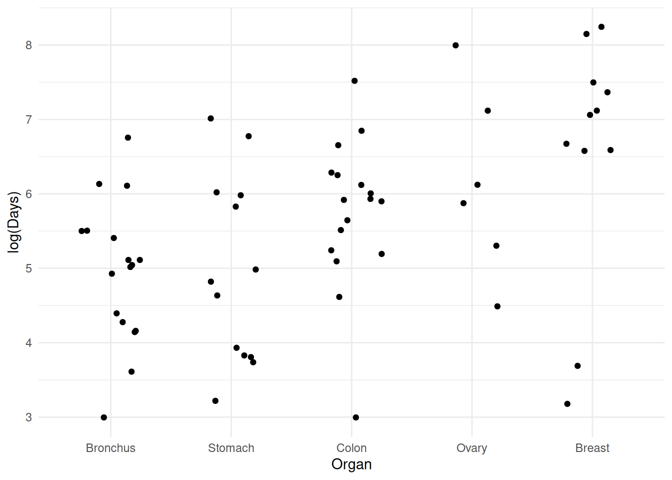 m <- lm(log(Survival) ~ Organ, data = CancerSurvival)