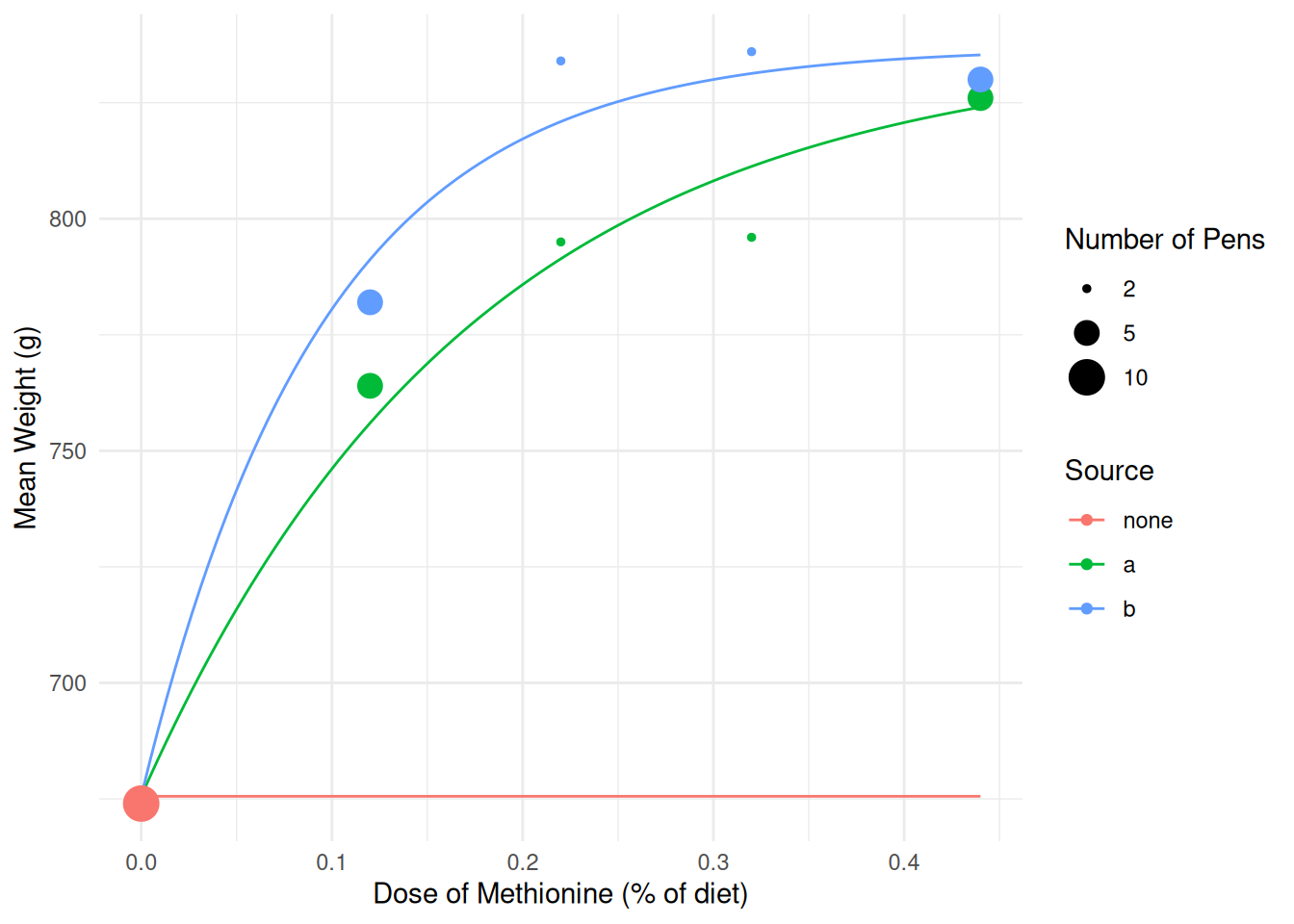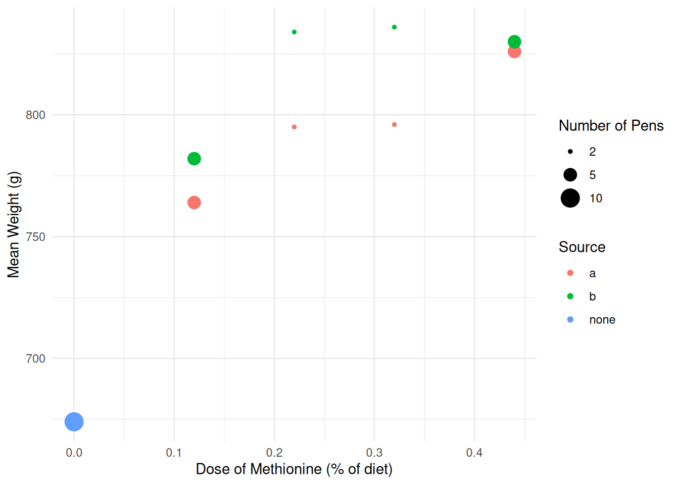 labs(x = "Dose of Methionine (% of diet)", y = "Mean Weight (g)",