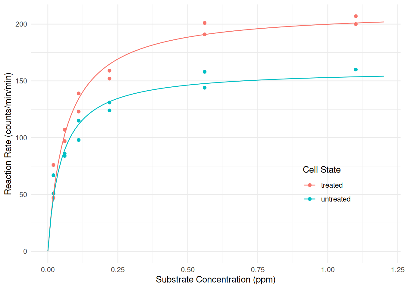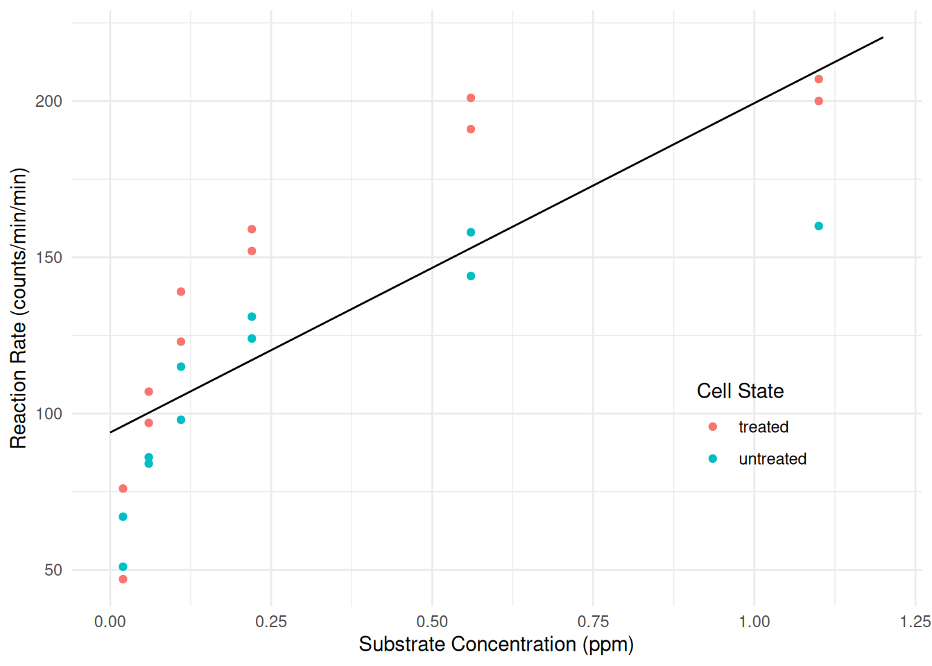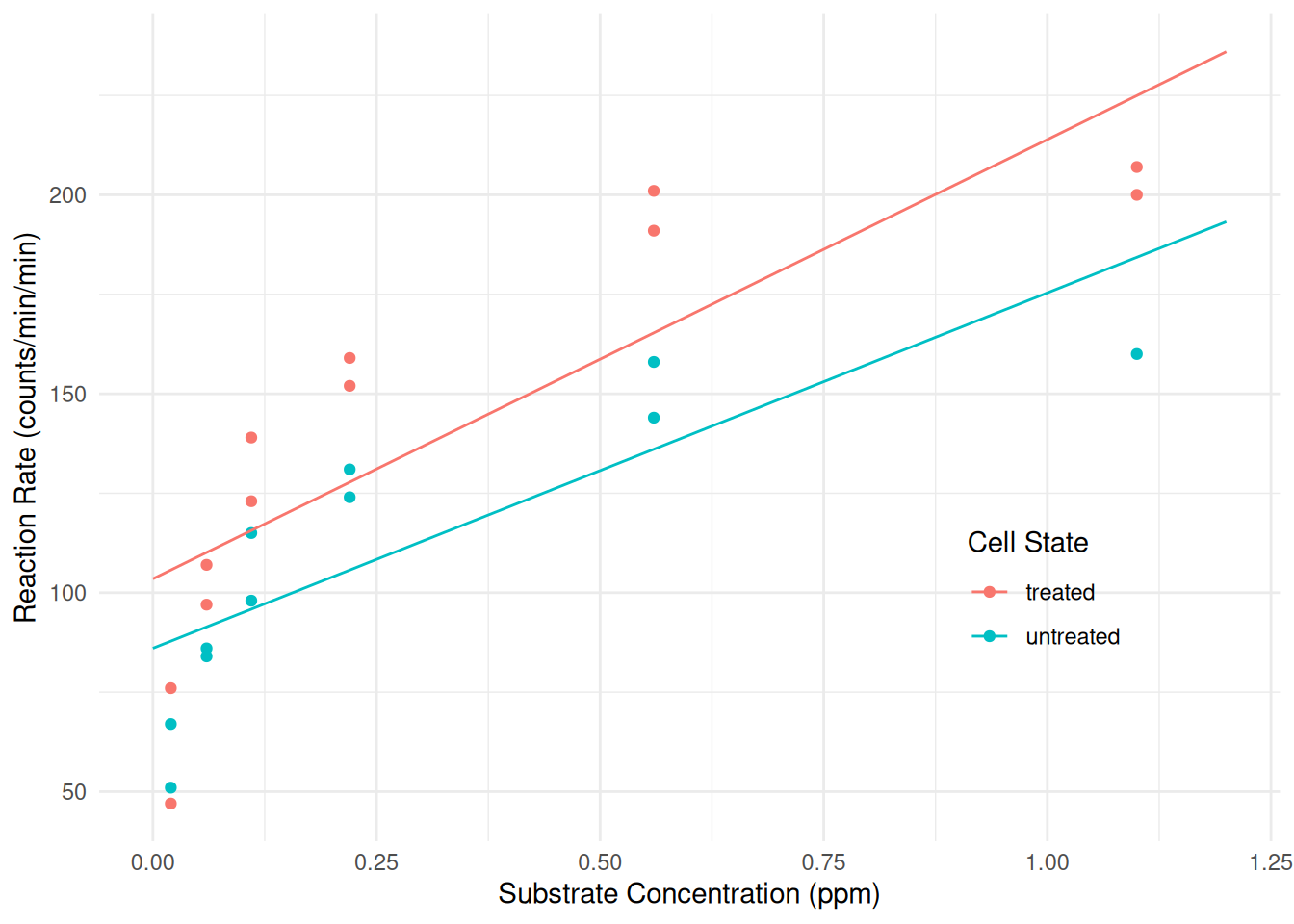 Now consider a linear model that will assume a linear relationship between reaction rate and concentration that is different for treated versus untreated cells (i.e., an “interaction” between substrate concentration and cell state).
