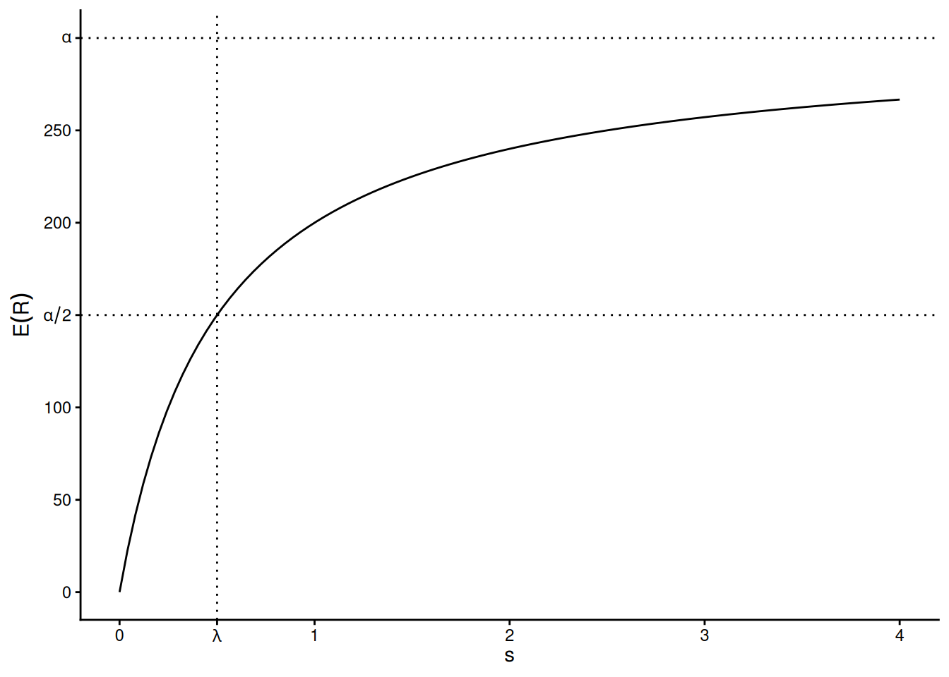 The interpretation of \(\alpha\) can be seen by taking the limit of \(\alpha s/(\lambda + s)\) as \(s \rightarrow \infty\), and the interpretation of \(\lambda\) can be shown by replacing \(s\) with \(\lambda\) in \(\alpha s/(\lambda + s)\) which gives \(\alpha/2\).↩︎