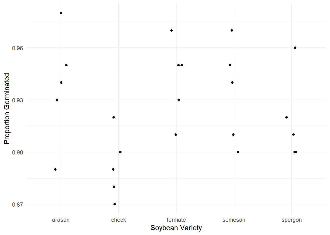 labs(x = "Soybean Variety", y = "Proportion Germinated")