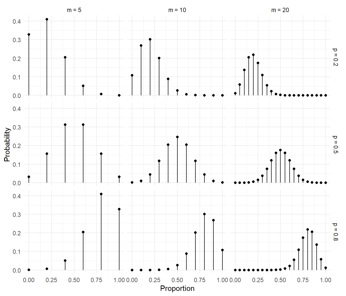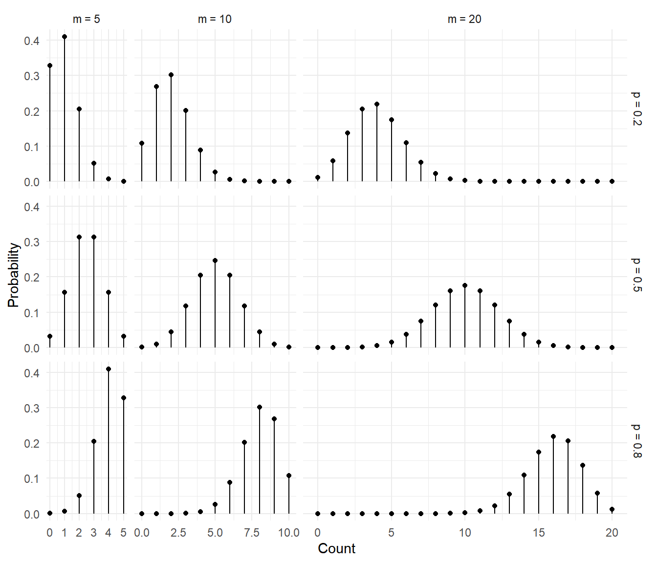 The figures below show several binomial distributions for different