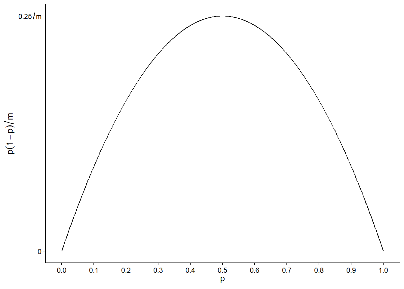 Note that the variance is at its maximum when \(p\) = 0.5 and gets smaller as \(p\) moves away from 0.5 toward \(p\) = 0 or \(p\) = 1.