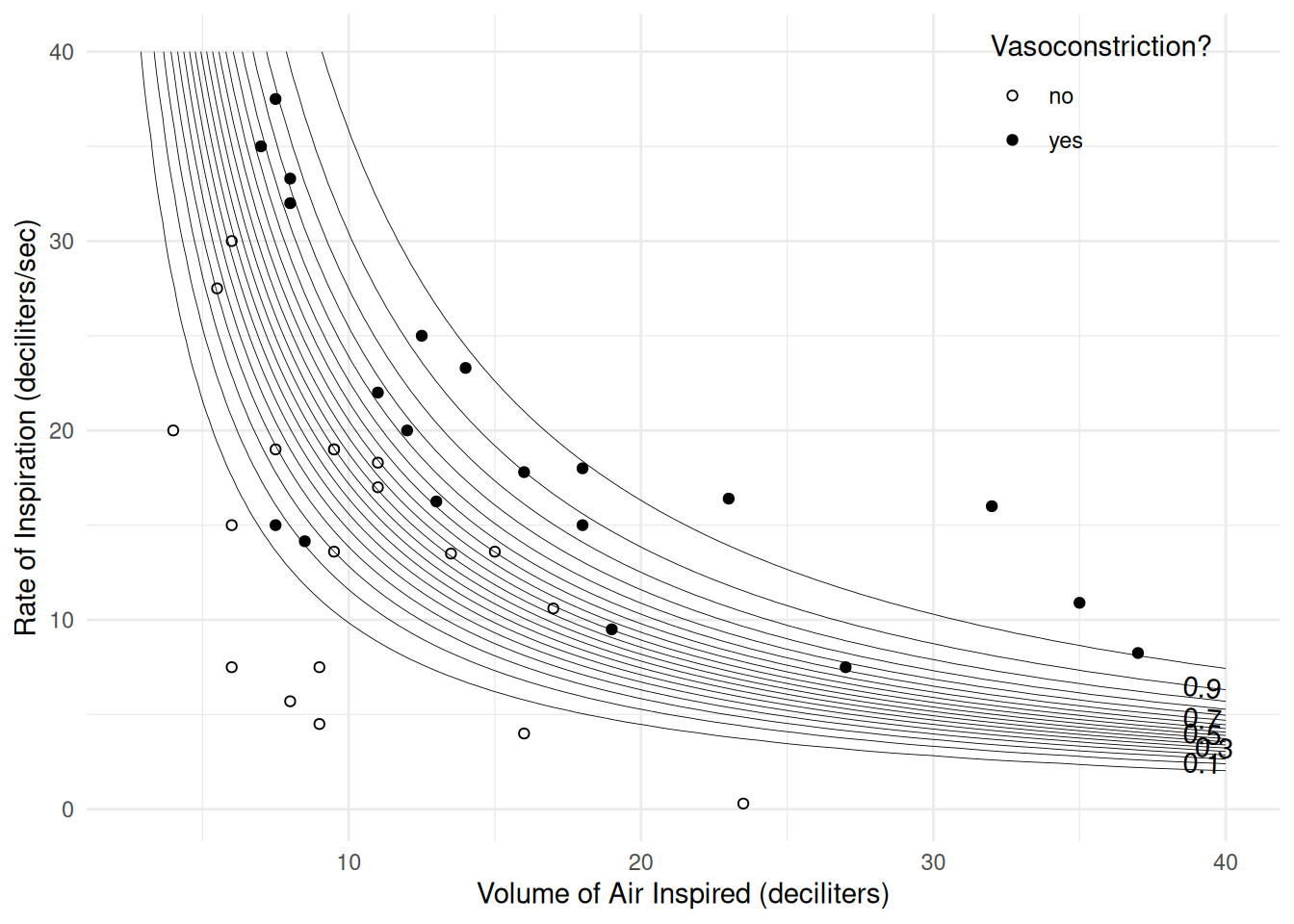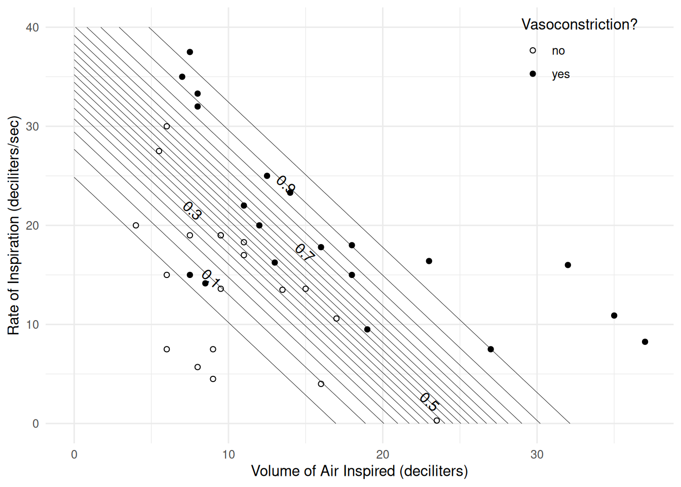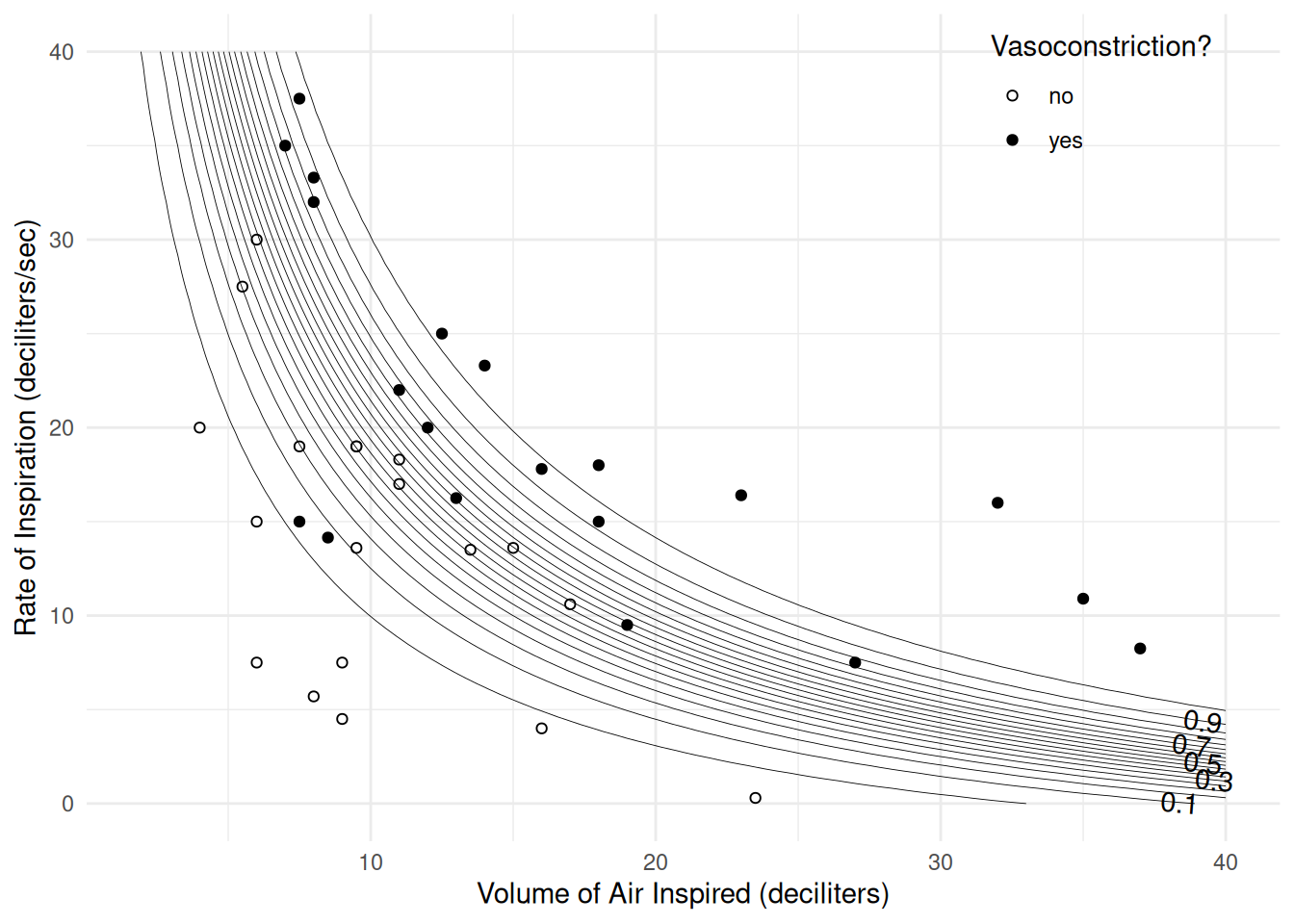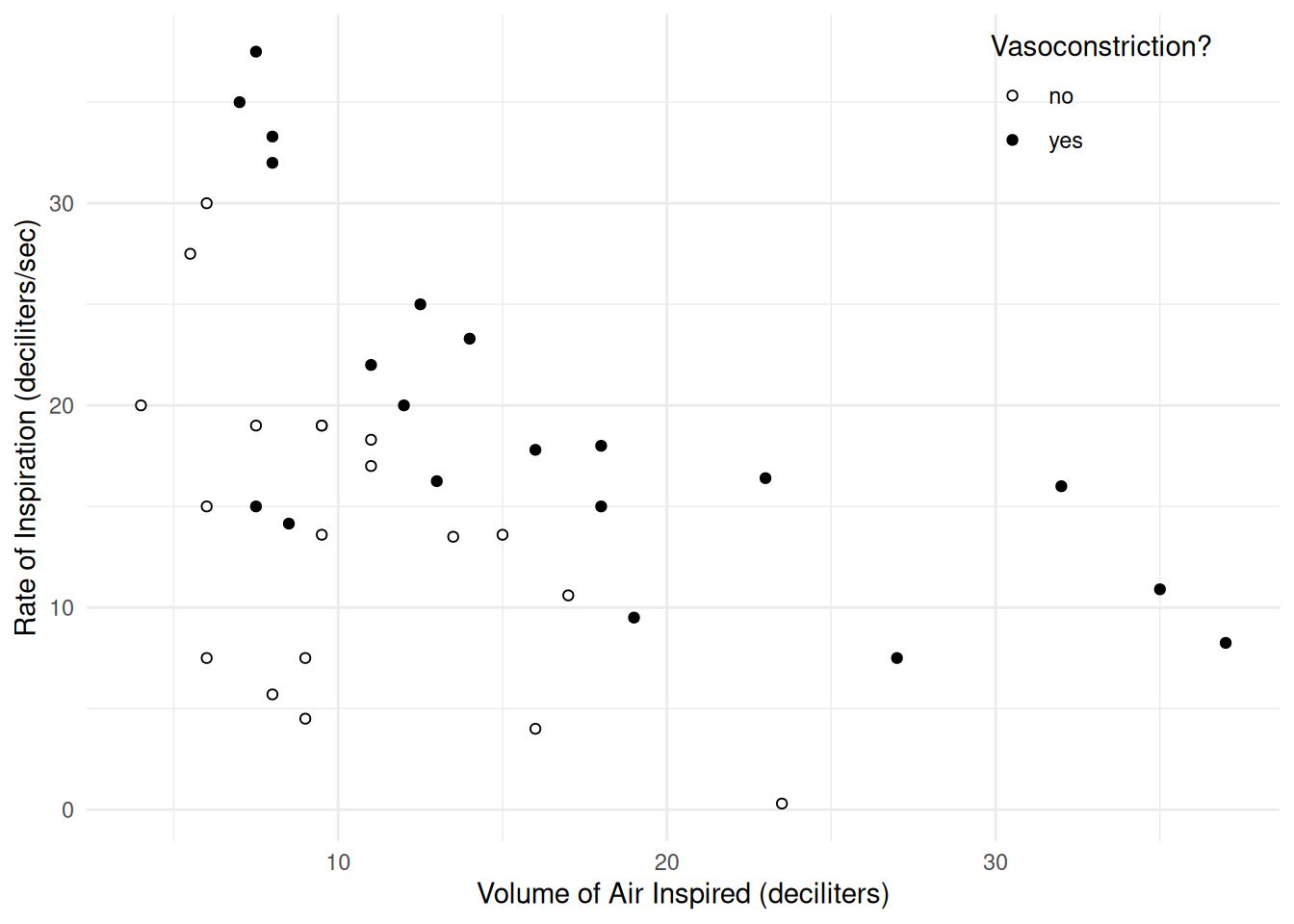 Here is a scatterplot of volume and rate, with point color indicating vasoconstriction.