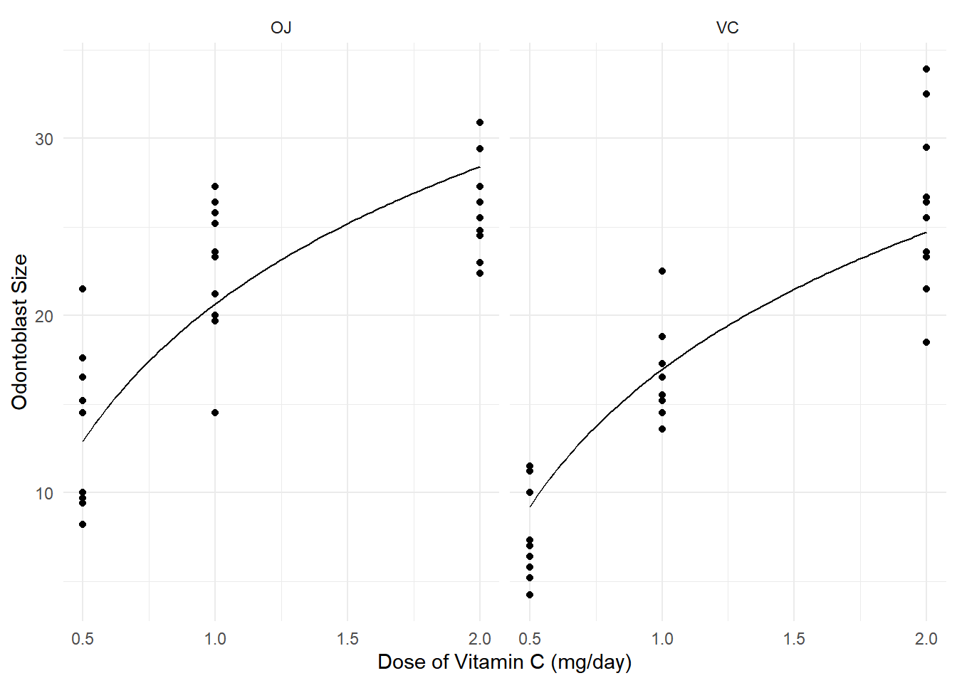 labs(x = "Dose of Vitamin C (mg/day)", y = "Odontoblast Size") +