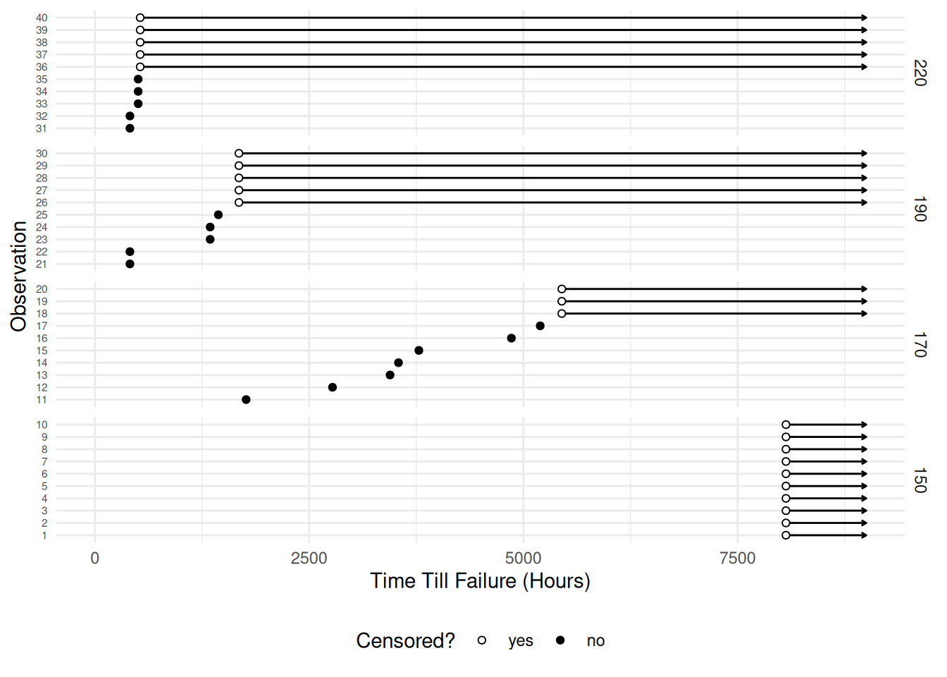 Interval-Censoring: We only know that \(a < T < b\) for some constants \(a < b\). Note that right-censoring can be viewed as a special case where \(b = \infty\) and left-censoring can be viewed as a special case where \(a = 0\). Interval censoring occurs in survival analysis when units are only periodically observed.