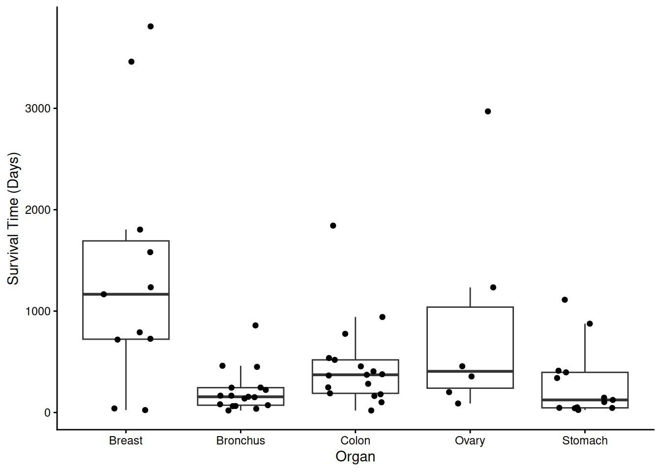 p <- ggplot(CancerSurvival, aes(x = Organ, y = Survival)) +