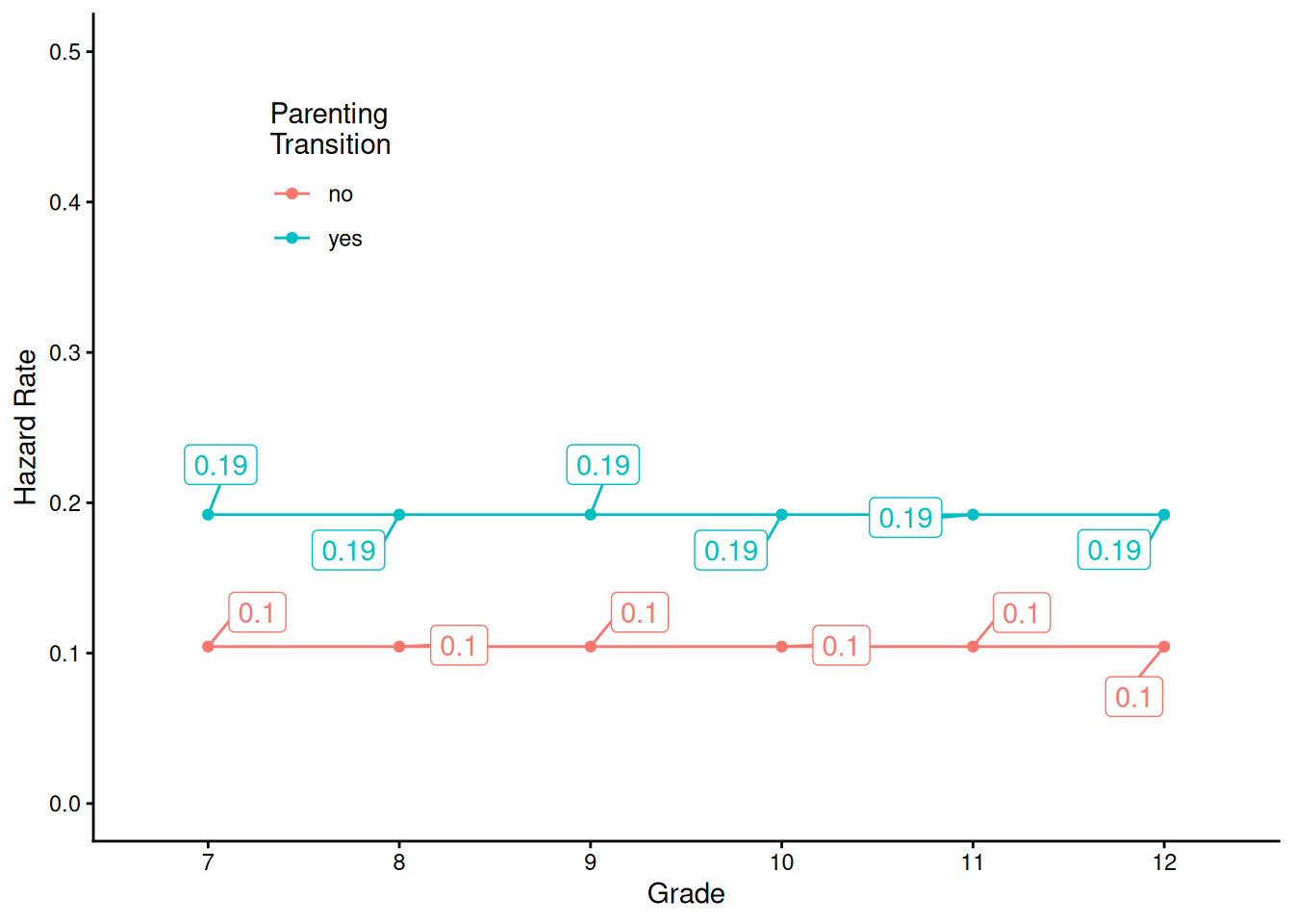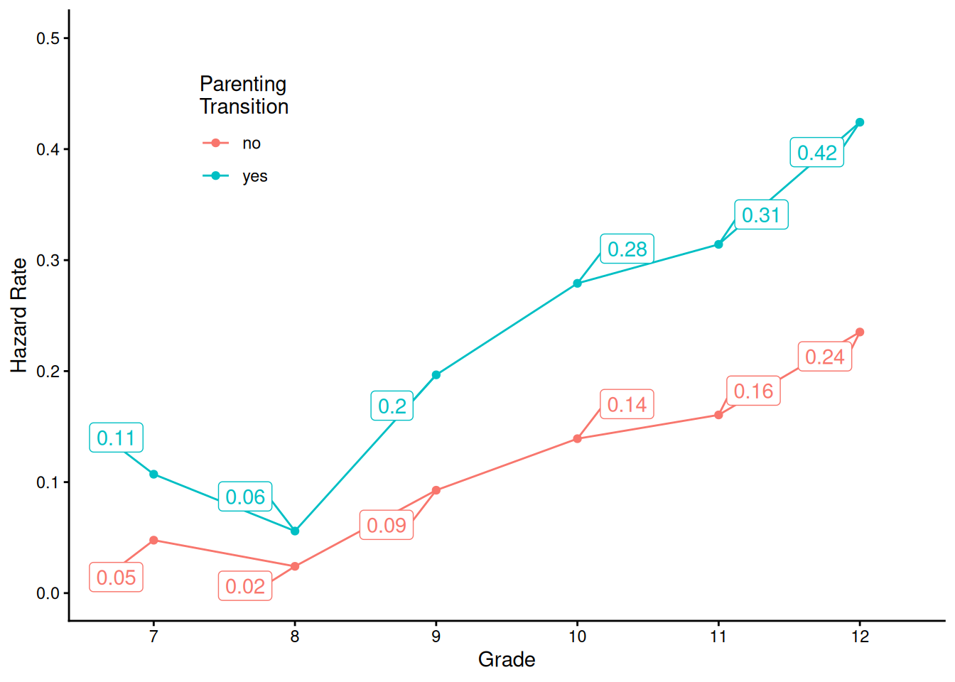 labs(x = "Grade", y = "Hazard Rate", color = "Parenting\nTransition") +