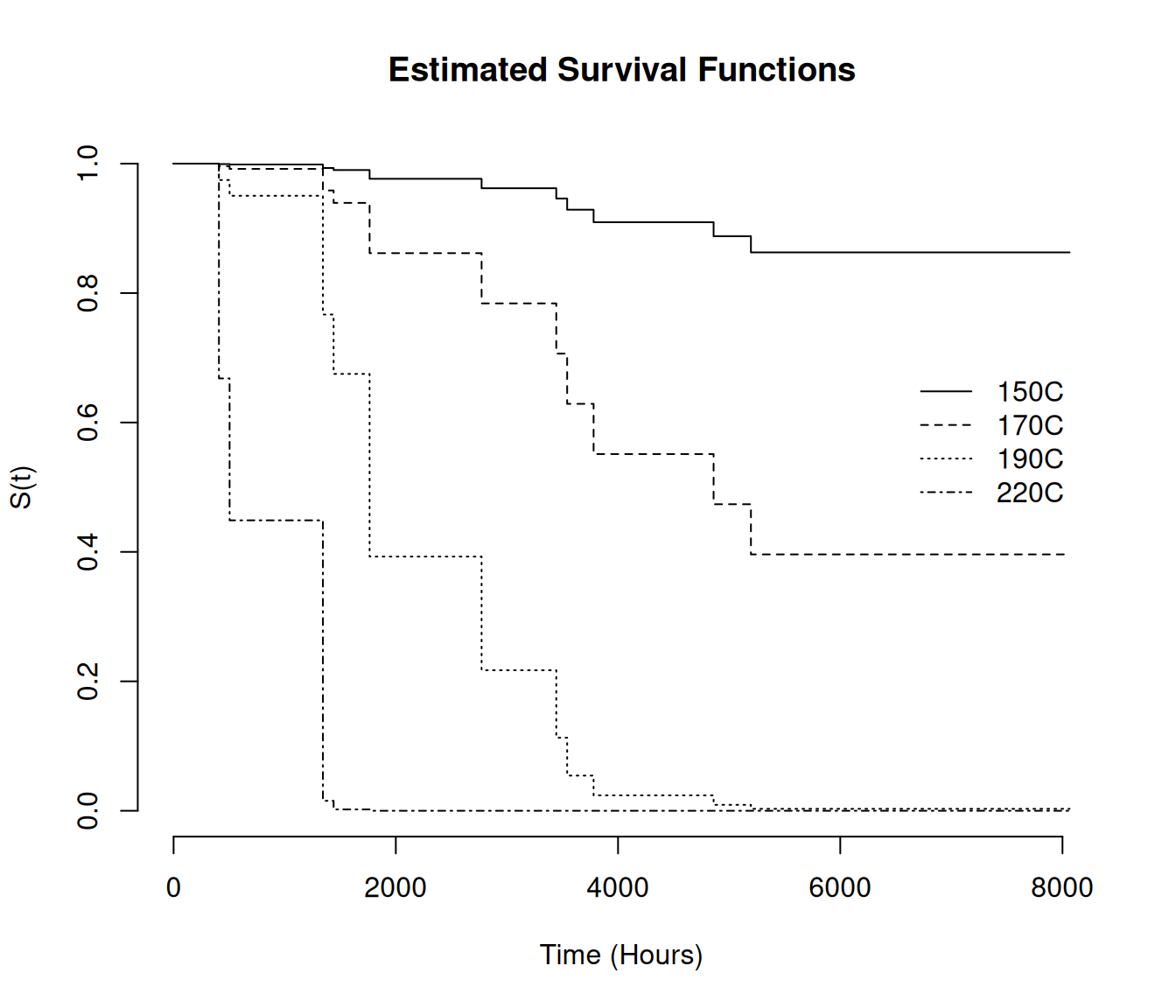 legend(6500, 0.7, legend = c("150C", "170C", "190C", "220C"), lty = 1:4, bty = "n")